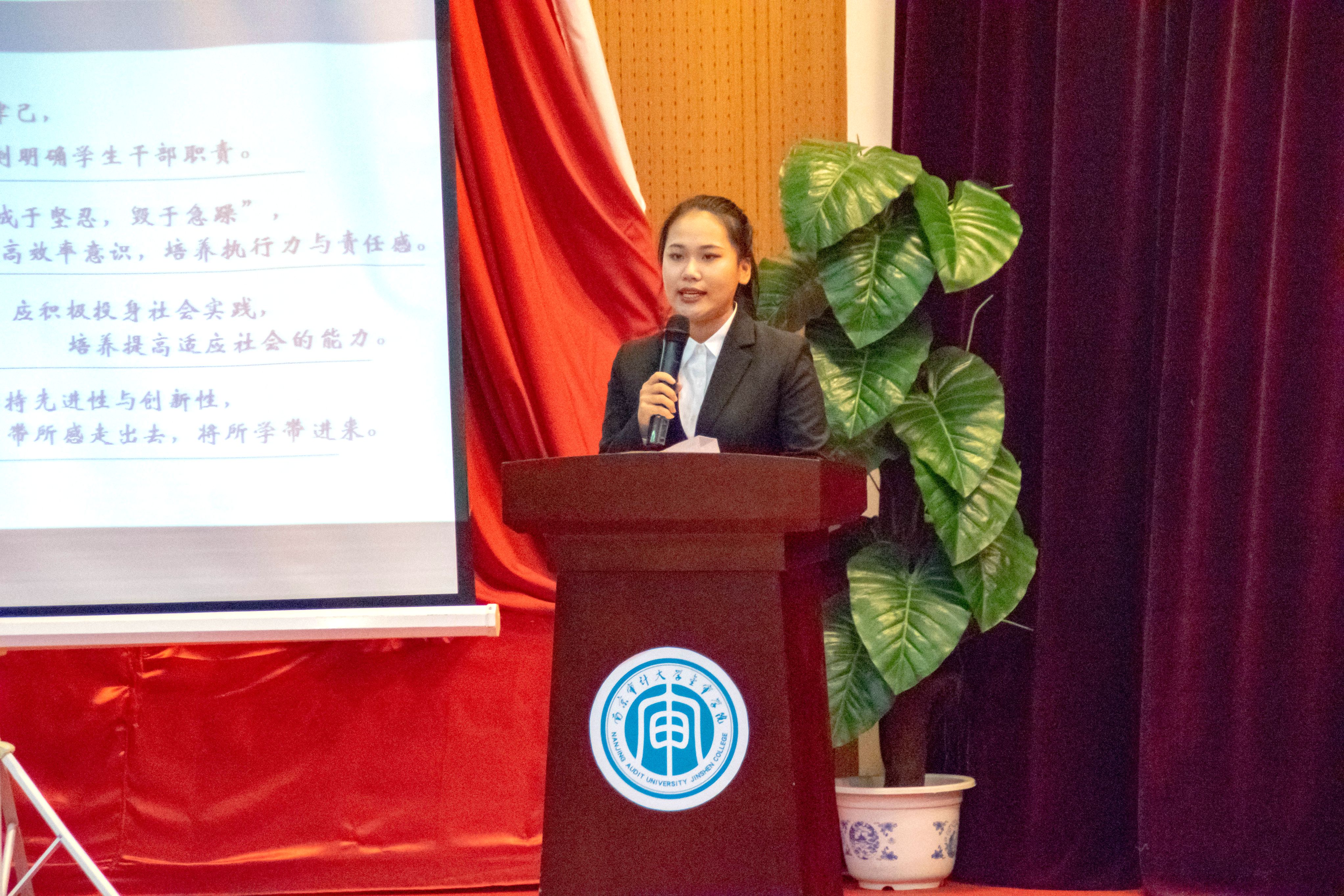 随后进入大会第三项议程,学生干部经验交流发言。首先,校学生会主席陈炎炎分享从一名干事到学生会主席的点滴,与我们一起回顾了她的心路历程,她的体会是做一名学生干部首先要在生活中发挥模范带头作用,在工作中锐意进取,开拓创新。