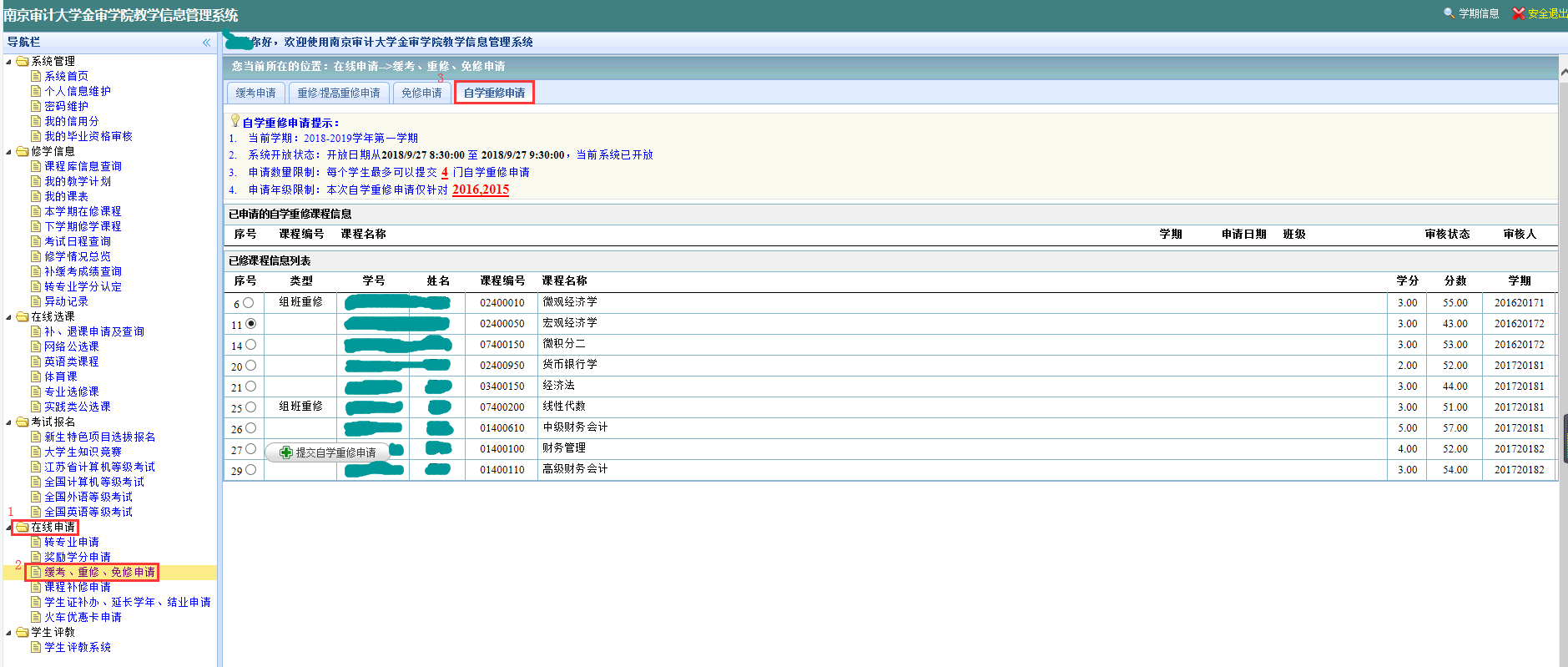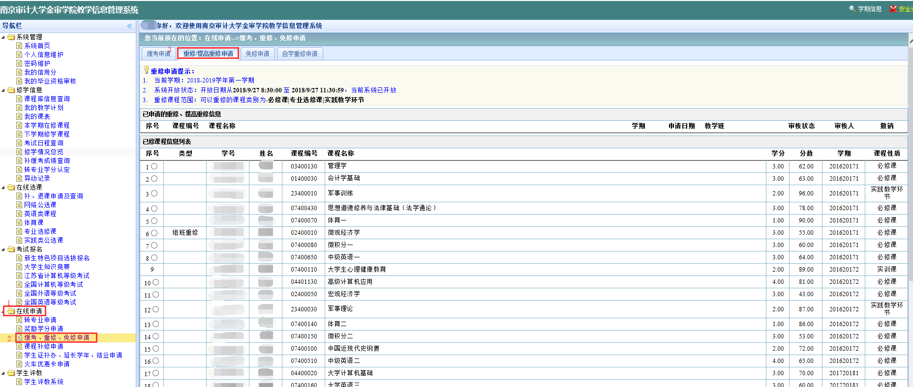 1.组班重修(含指导重修、二级学院答疑、实践、教学环节等):根据课程性质和人数等因素,已将组班重修的班级、课程和名单编排进教务系统,请相应考生根据教务管理办公室安排的时间、地点准时上课,不用在教务系统申请。