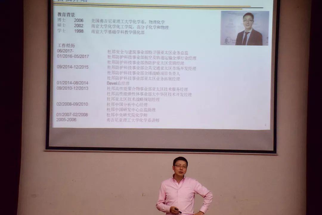 紧接着,倪锁龙博士向我们介绍了杜邦公司跨世纪的发展历程。在火药年代里,杜邦公司成立于特拉华州威明顿市的白兰地河畔。在化工与聚合物革命时期,杜邦公司成立了名为“实验室”的研究实验室,这里成为尼龙、特卫强、凯芙拉和Sorona聚合物等伟大创新的发源地。