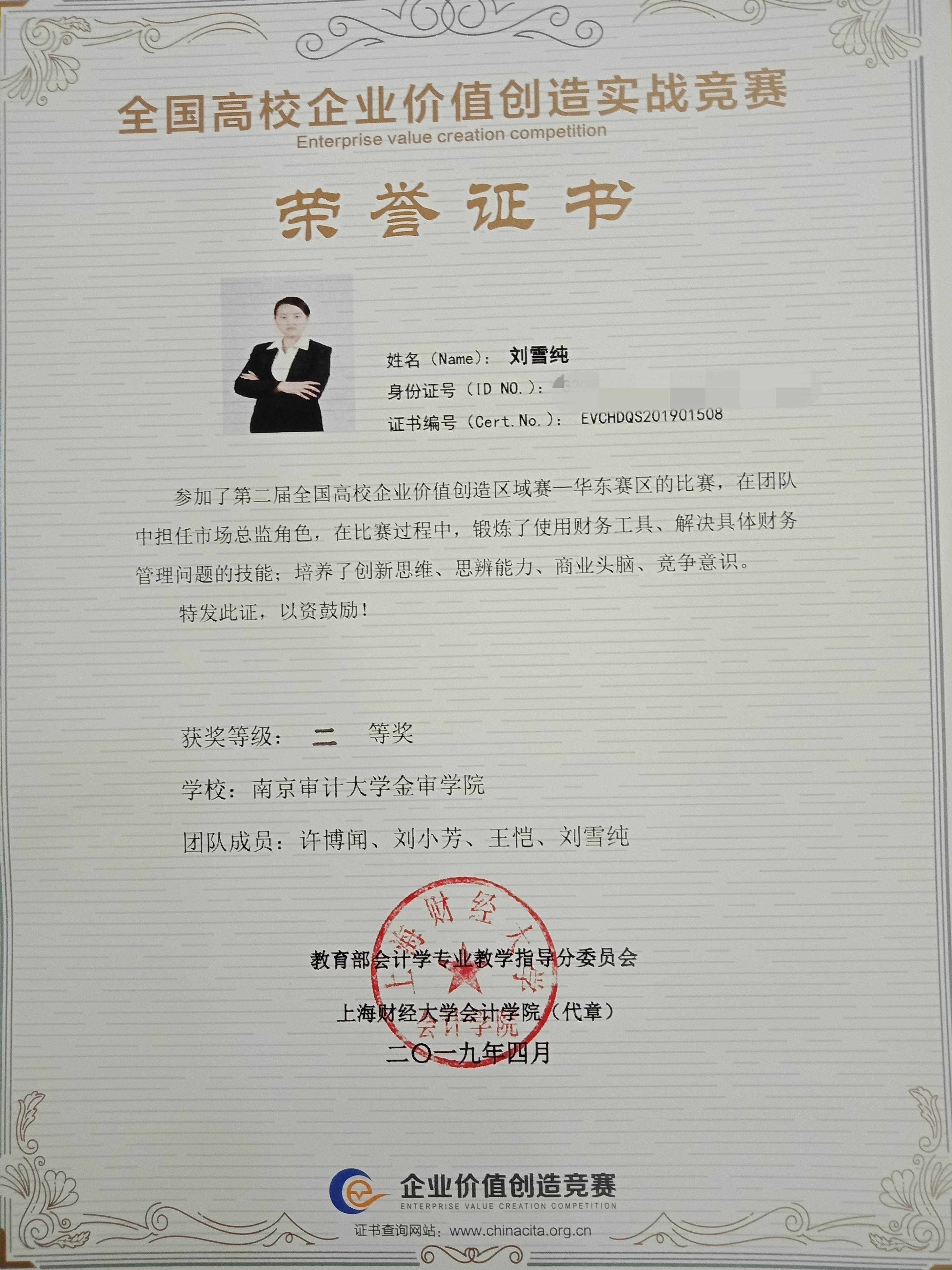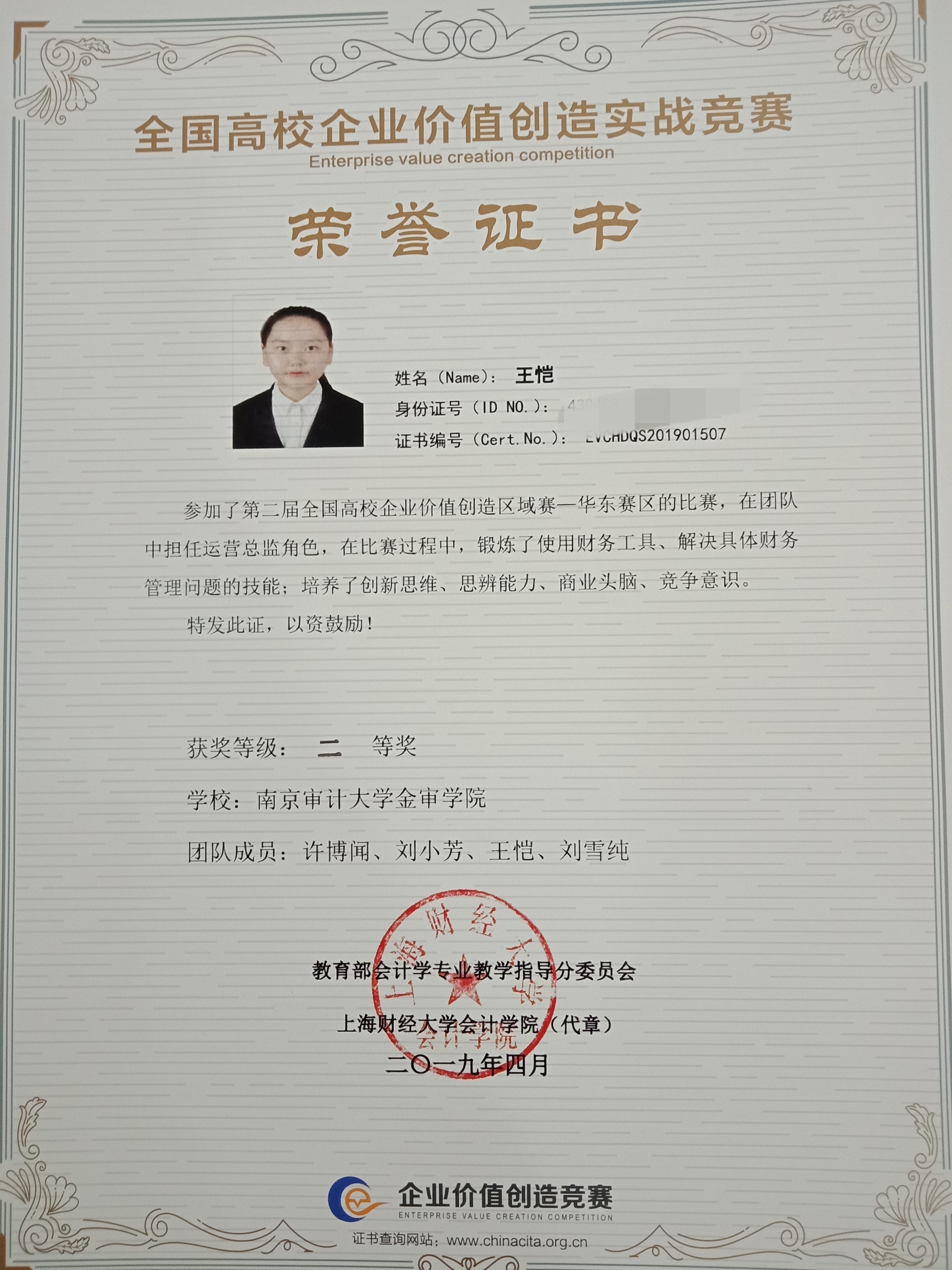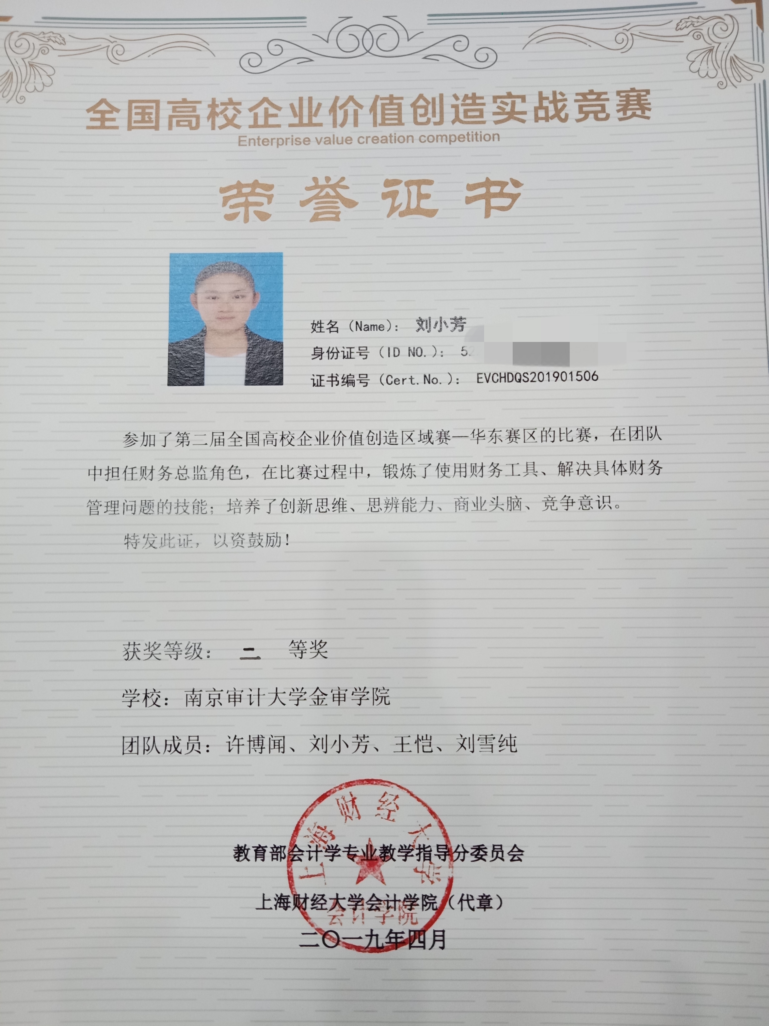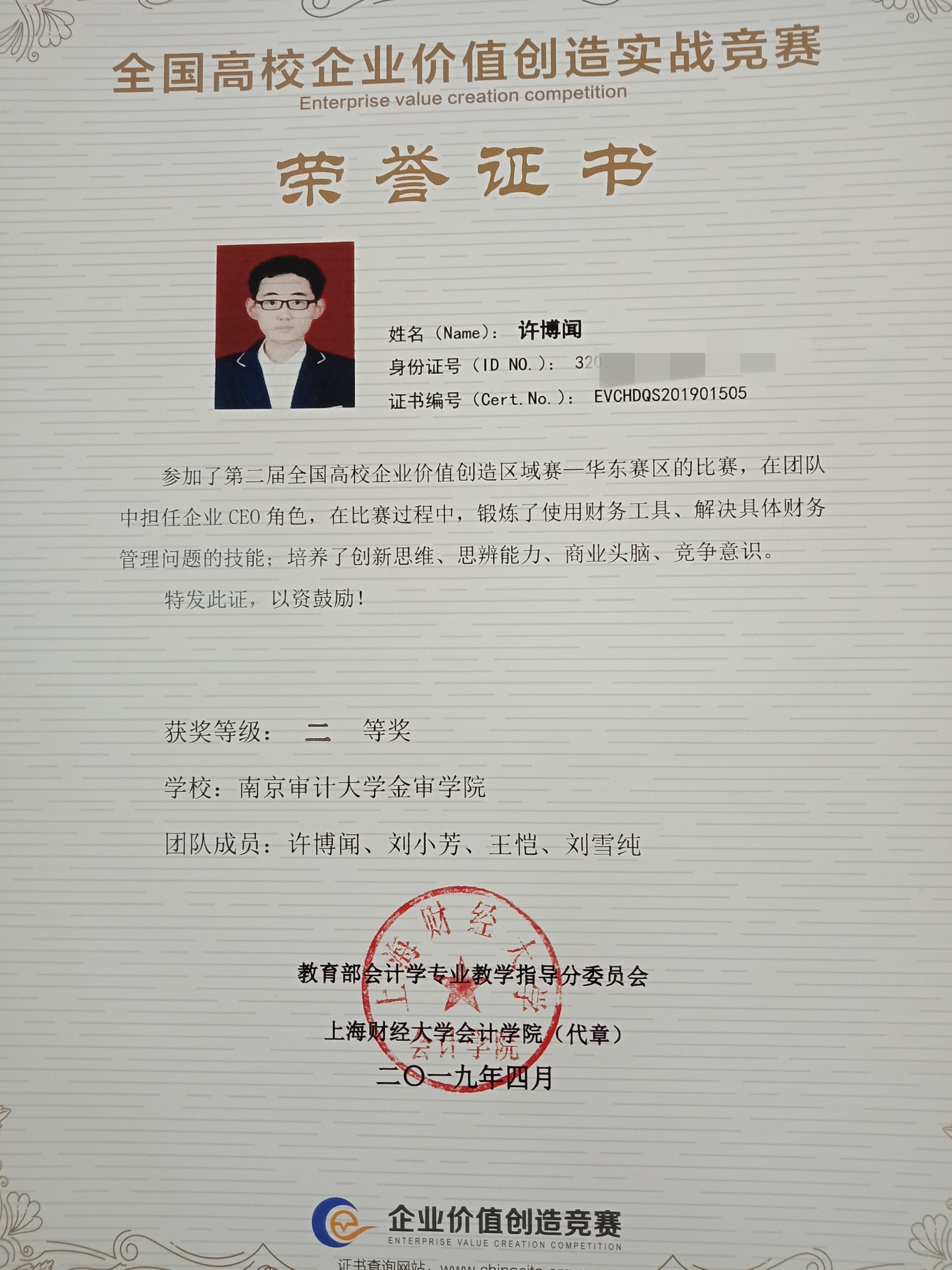 本次大赛,进入华东区区域赛的共有来自山东、安徽、江苏、浙江、上海等地区的42支队伍参加。我校风华会审财智联盟协助会计与审计学院举办的校内选拔赛于2018年12月举行,参赛人数高达134人,经过激励的赛事比拼,最终,16级财管1班的许博闻和刘小芳、16级财管2班的刘雪纯、16级审计1班的王恺四名同学脱颖而出代表我校参加此次比赛。经过仲怀公老师和倪梦娇老师近2个月细心指导,同学们的认真积极备战,我校最终获得华东赛区二等奖的好成绩