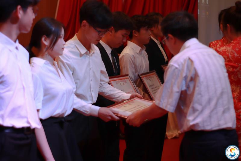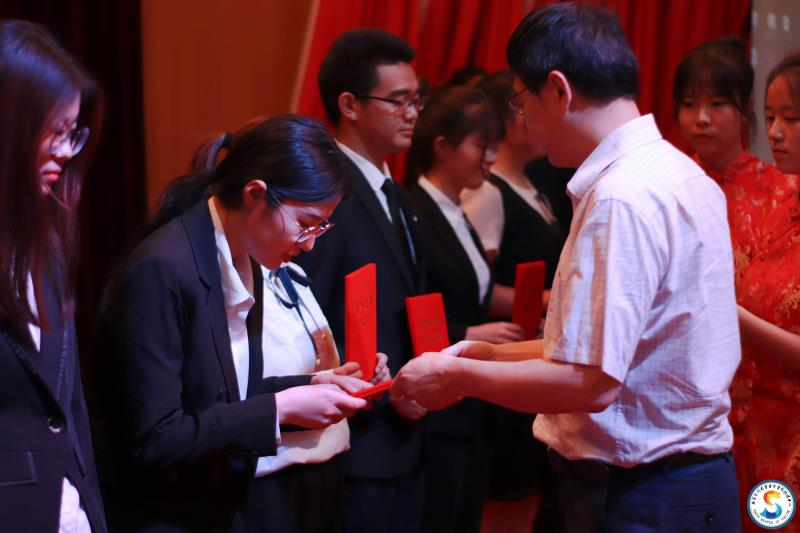 伴随着颁奖曲和全场的热烈掌声,校领导为获奖学生代表颁发奖状。