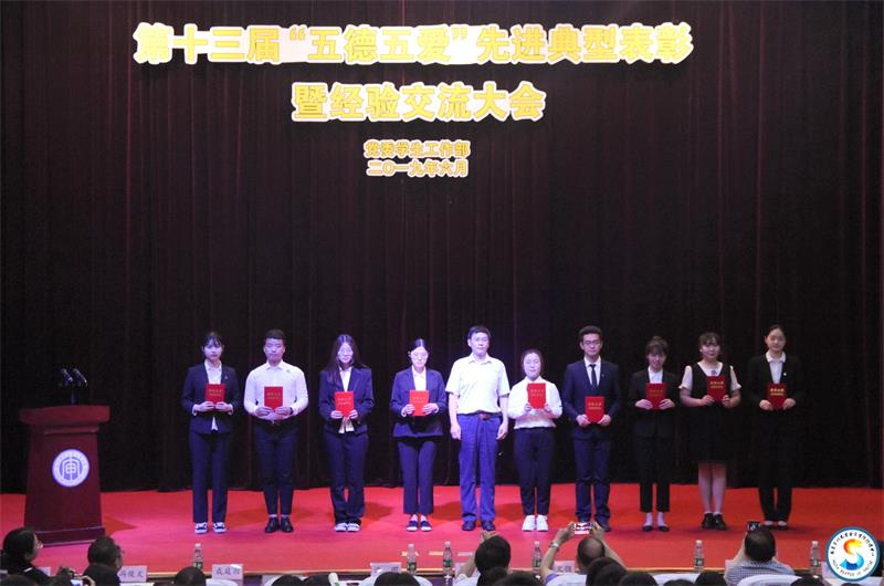 随后,党委学生工作部部长李文强宣读《关于表彰践行社会主义核心价值观第十三届“五德五爱”先进表彰决定》,经集体和个人申报,所在二级学院推荐,党委学生工作部评议,学院审核,评选出第十三届“五德五爱”集体先进典型149个,其中:学生组织13个,学生社团13个,班级54个,宿舍69个;“五德五爱”个人先进典型379人,其中:会审学院127人,金融学院99人,管理学院57人,信息学院29人,教育学院16人,艺术学院25人,国际商学院26人。