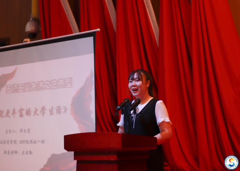 文艺先进典型代表,中共党员、17级税收1班的毕文菁同学,发表了“文艺成就更丰富的大学生活”为题的汇报。她在大学期间积极参加文艺活动,先后获得56个奖项。她以自身为例,充分诠释了“逆风的方向,更适合飞翔”。在面对困难时,要勇于化阻力为动力,不气馁,一步一个脚印。坚持,就一定能收获成功。