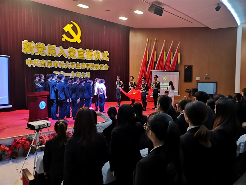 全体与会人员起立,齐声高唱《国际歌》,校党委学工部李文强部长宣读了108位新党员名单,全体新党员在领誓人的带领下均持立正姿势,面向党旗,举右手握拳过肩,庄重严肃地跟随领誓人逐句齐声宣誓,宣誓声响彻整个会场。