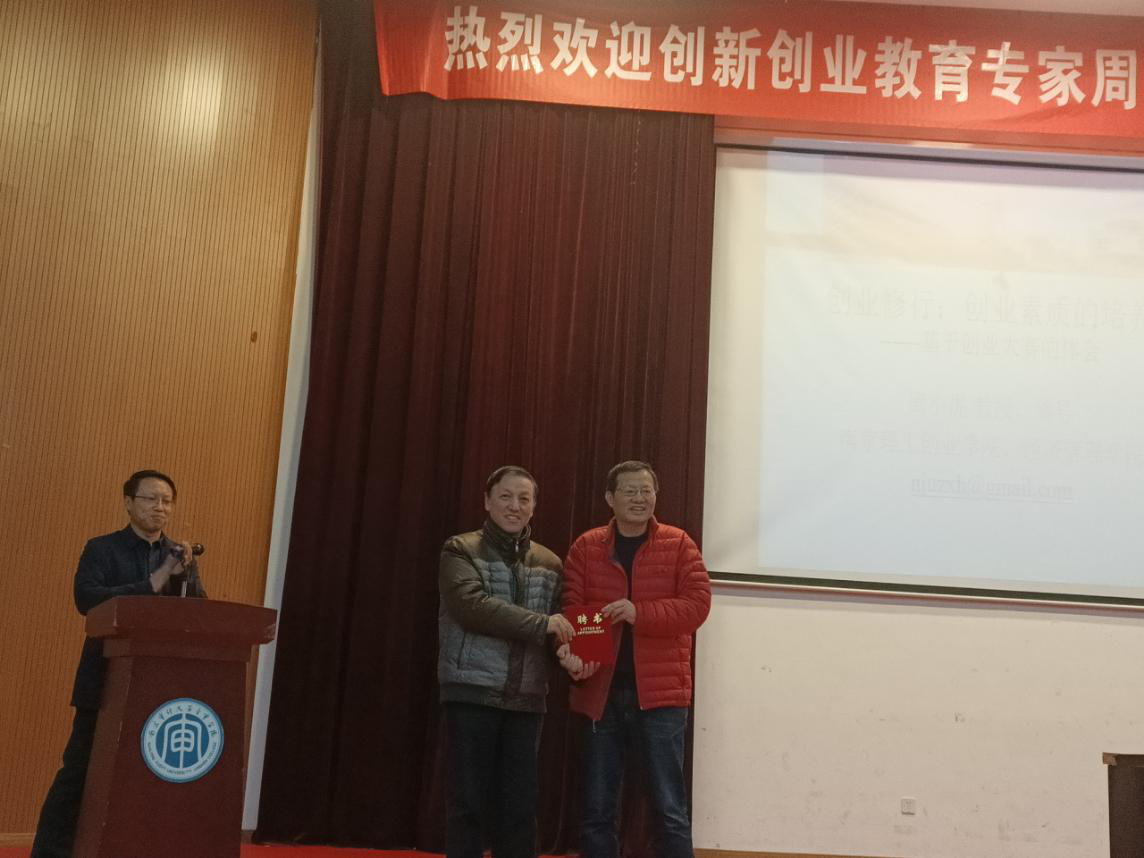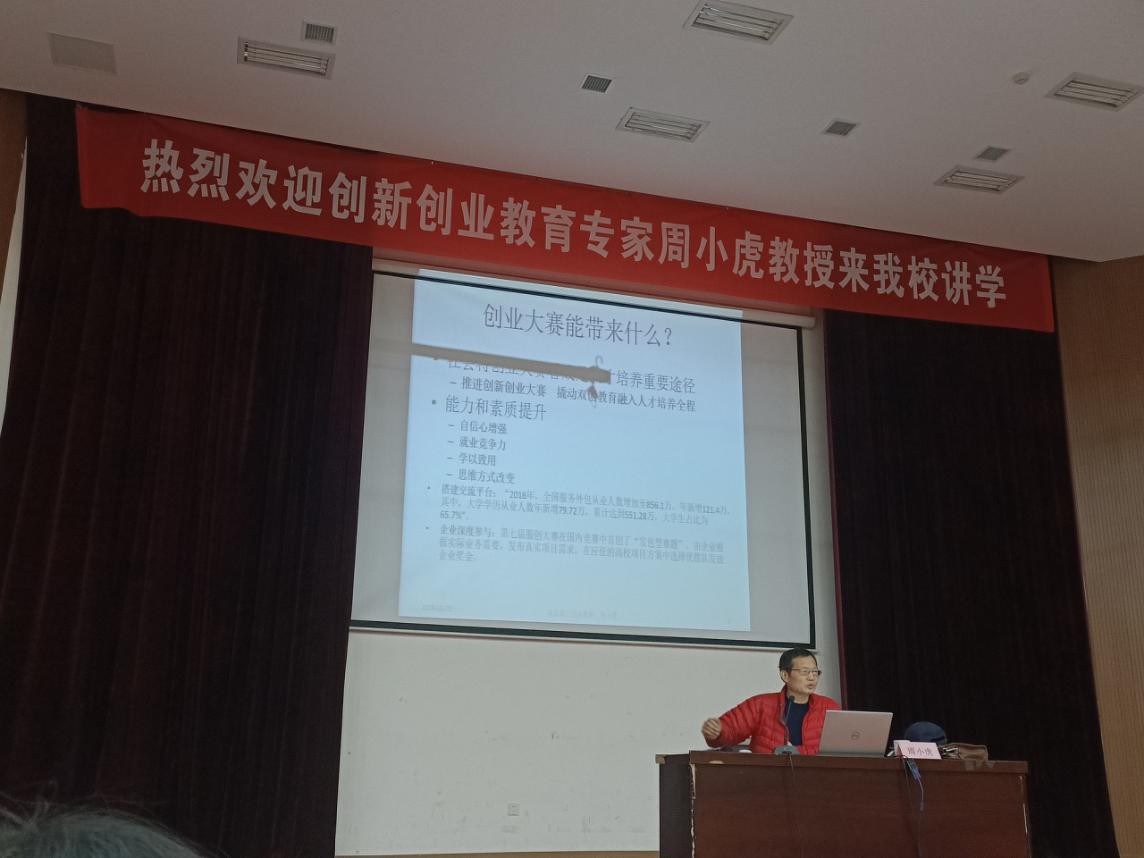 2019年12月25日下午,南京理工大学创业教育学院副院长、教授、博士生导师周小虎受邀来我校,在图书馆报告厅做了创新创业训练项目讲座。由会计与审计学院党总支书记庄怀军主持。南京审计大学金审学院副院长、会计与审计学院院长尹平,江苏省企业联合会、江苏省企业家协会常务副会长陈华蔚及会审院全体辅导员出席。