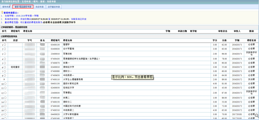 2.跟班重修:教务系统对本学期开课中有与重修课程名称、学分相同的课程,且≤16人的重修课程设置为跟班重修形式并通知到相关学院。跟班重修学生必须在2月19日上午9点-2月20日下午5点进入教务系统点选重修所跟班级。
