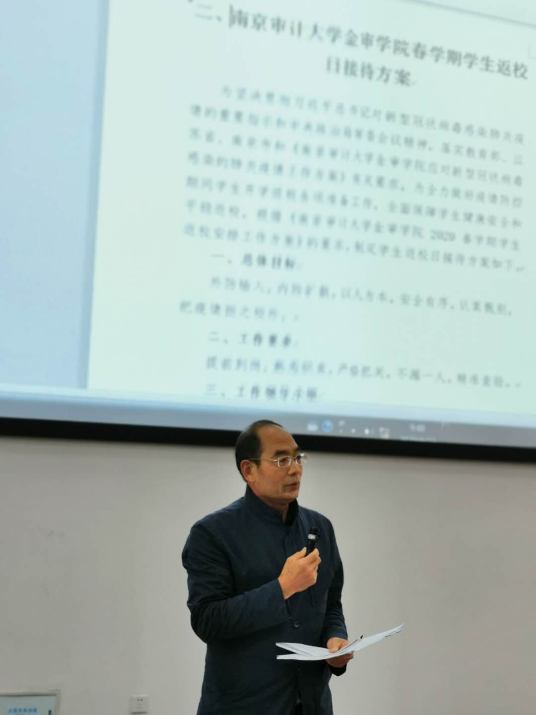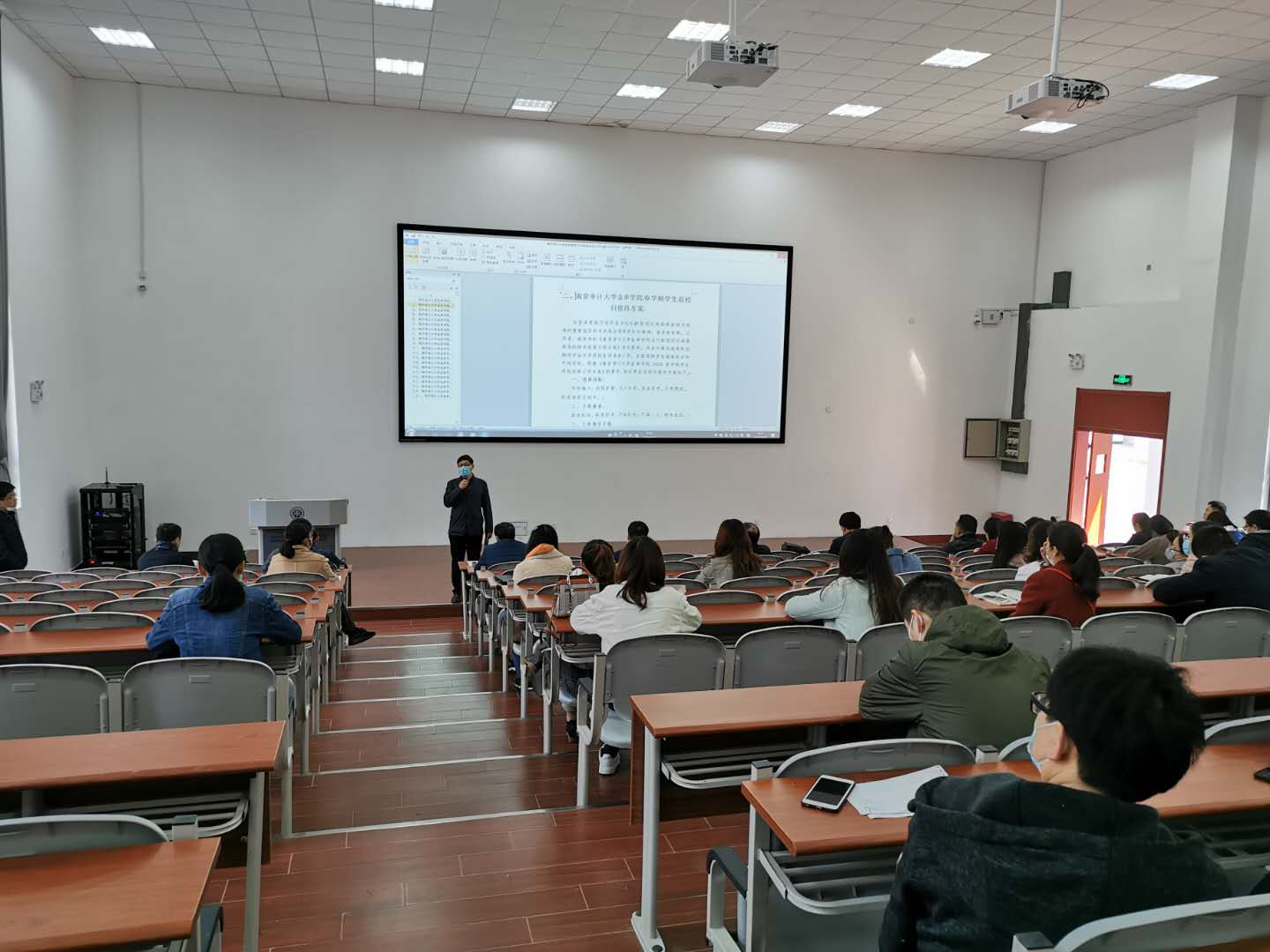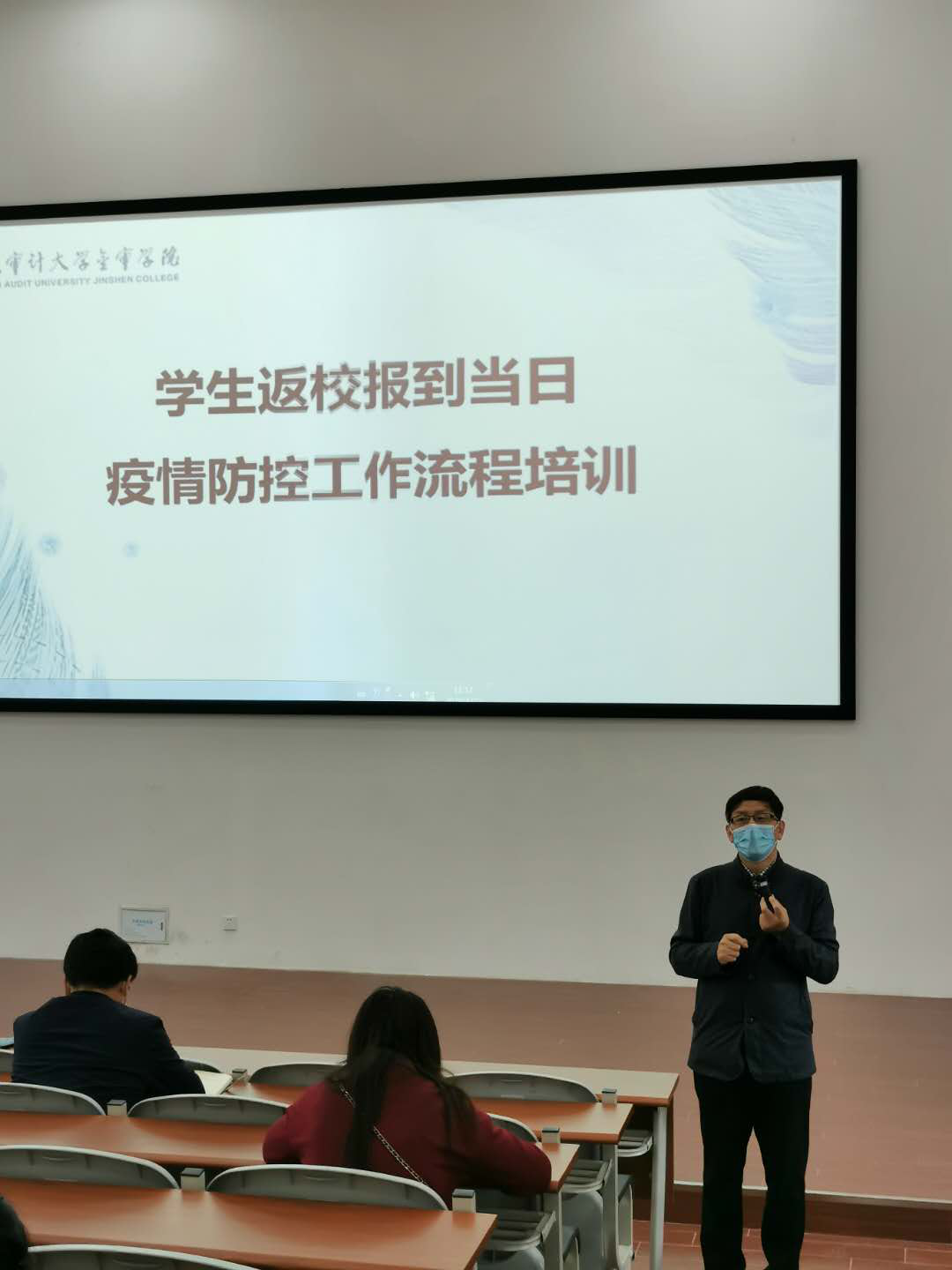 4月22日上午9时,我校在C东101举办了学生返校当日疫情防控工作流程培训。纪委书记沈明、学工办负责人、二级学院党总支书记、全体辅导员参与培训,培训会议由学工办副主任朱振飞主持。