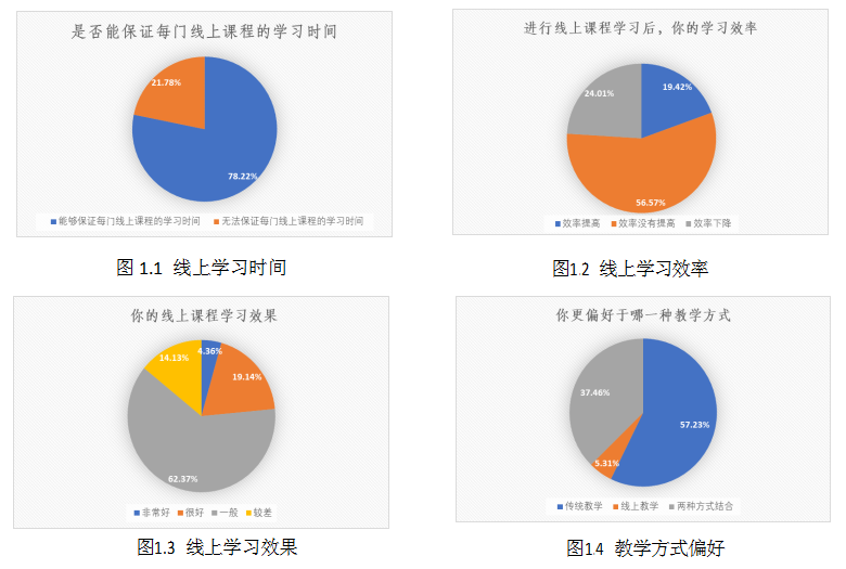 在整体的学习情况上,78.22%认为在学习时间上是可以保证的,但是在学习效率和学习效果方面相对欠佳。56.57%的学生,认为“学习效率没有提高”。甚至有 24.01%的学生认为采用线上课程学习的方式使得学习效率下降。62.37%的学生认为线上课程学习效果一般。57.23%的学生表示相较于网络教学,更加偏好传统教学方式。从整体上来说 62.93%的学生认为线上课程学习、辅导效果不理想。