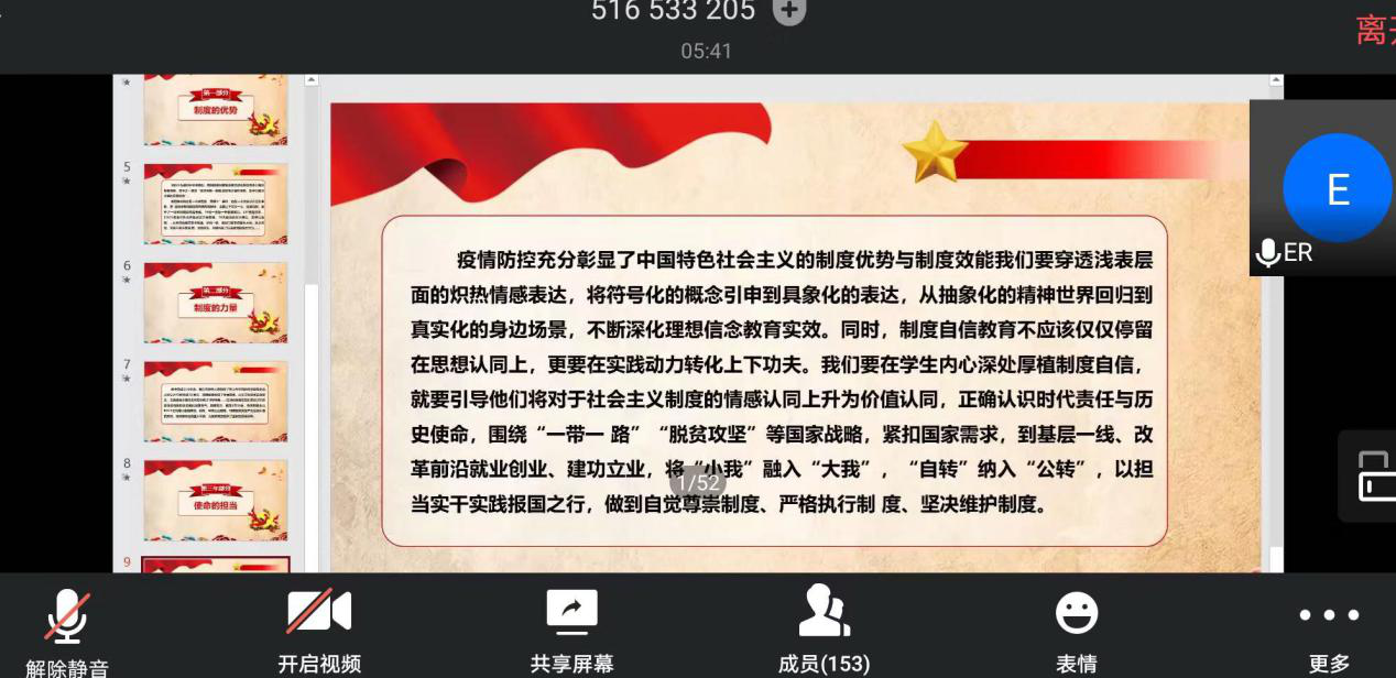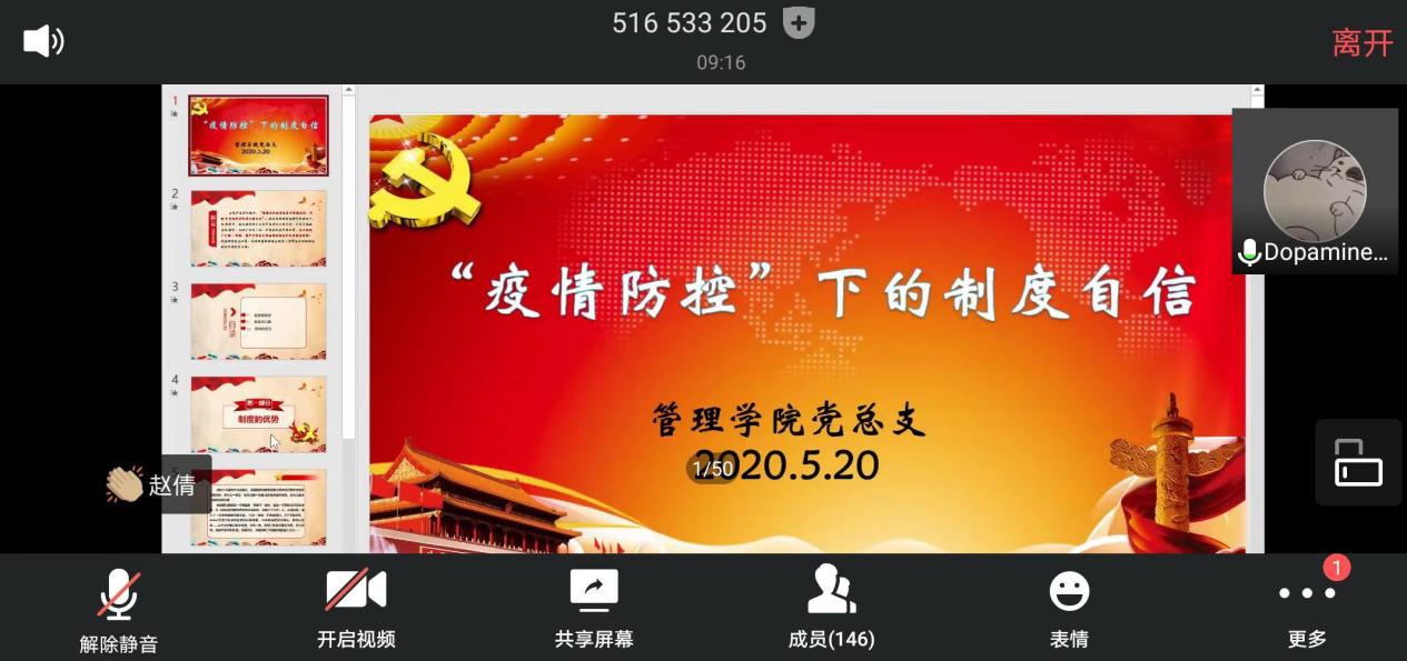 管理学院党总支书记季媛媛组织了一堂关于制度自信的“特殊”党课,到场的教师和学生党员只有12人,但是云端的网络上却有200多名学生。本次党课从“讲清制度优势,强化精神感召”、“阐明制度力量,挖掘深刻内涵”、“激发使命担当,贯通情志力行”三个角度入手,围绕“一带一路”“脱贫攻坚”等国家战略,紧扣国家需求,进一步阐释制度国家实力从何而来,制度力量从何而现,中国底气从何而立,引导学生将“小我”融入“大我”,“自转”纳入“公转”,树立正确的历史观、大局观和角色观,把对于社会主义制度的情感认同上升为价值认同,正确认识时代责任与历史使命。以担当实干实践报国之行,自觉尊崇制度、严格执行制度、坚决维护制度。