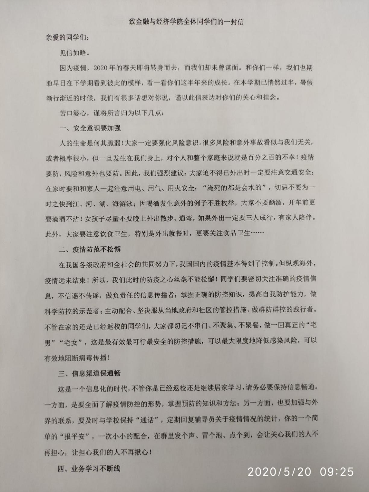 为增强同学们的防疫知识和安全意识,引导同学们坚定的抗疫信心,激发广大学生抗疫斗志,金融与经济学院的辅导员老师们对所有同学们开展了新学期第一课。
