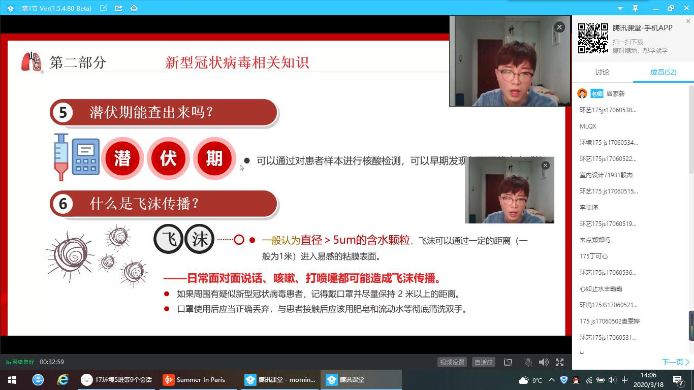 随后,临时班级、团支部负责人和同学们都纷纷表示,有国才有家,才有个人,对大学生来说,最好的爱国就是做好当下应该做的事情,只要坚定信仰,我们一定能攻克难关。学生党员以及入党积极分子们表示在这样一个特殊时期,一定会起到党员的先锋模范作用,积极配合学校管理,带领大家认真学习。