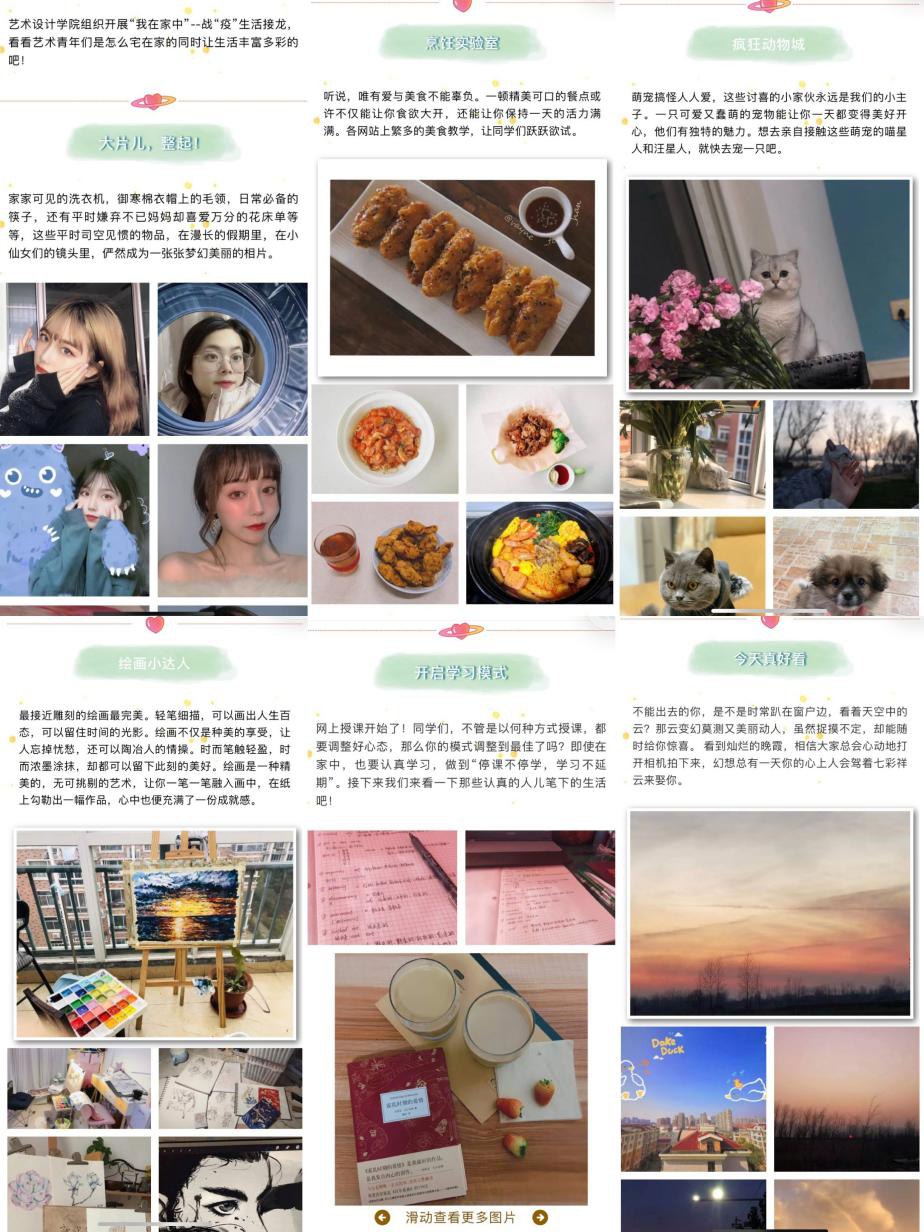 艺术设计学院二级心理工作站自疫情暴发至今一直密切关注学生的心理动态。由学院心理工作站牵头,在线上对居家学习的学生进行心理疏导,做学生的知心朋友。面向全院开展了形式多样的心理活动。如“我在家中——战疫生活接龙”活动,引导学生发现生活中的美。对返校生进行心理摸排工作,重点学生重点关注,突出对学生的生命健康教育,引导学生认知生命、尊重生命、珍惜生命,树立积极、乐观、向上的人生观念。