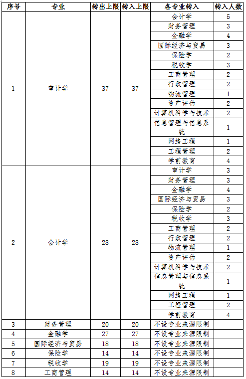 3. 实验班学生转入其他学院专业的比例为20%,即转出人数不得超过10人,其中金融实验班与管理实验班各转入审计学专业不超4人,转入会计专业不超过4人,转入财务管理专业不超过2人,操作程序与普通类转专业学生一致;