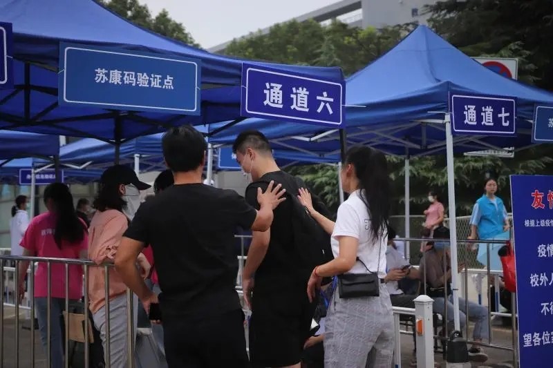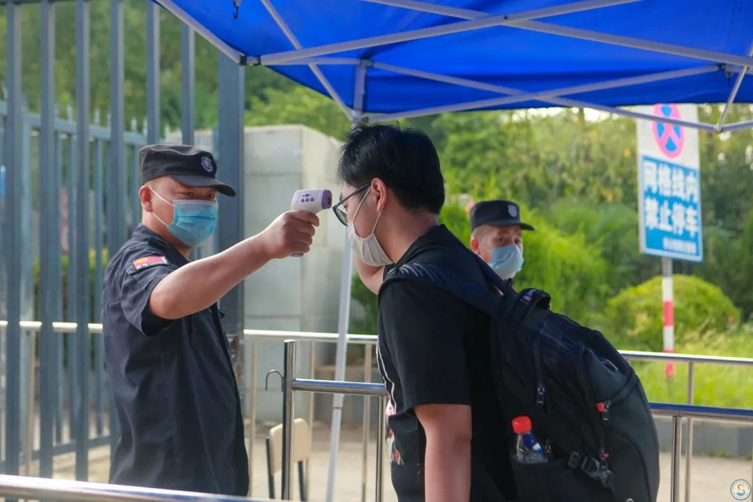2020年9月16日早上7点,各位负责老师以及学生志愿者已经在西门和北门有序列队,准备迎接新生。疫情防控尚未结束,本次新生报到实施“一查二测三核”策略:查看苏康码,测量体温,核对录取通知书,确保所有新生信息正确,身体状况符合开学报到规定。完成这一流程后,新生由对应的二级学院学生志愿者带领进入校园。