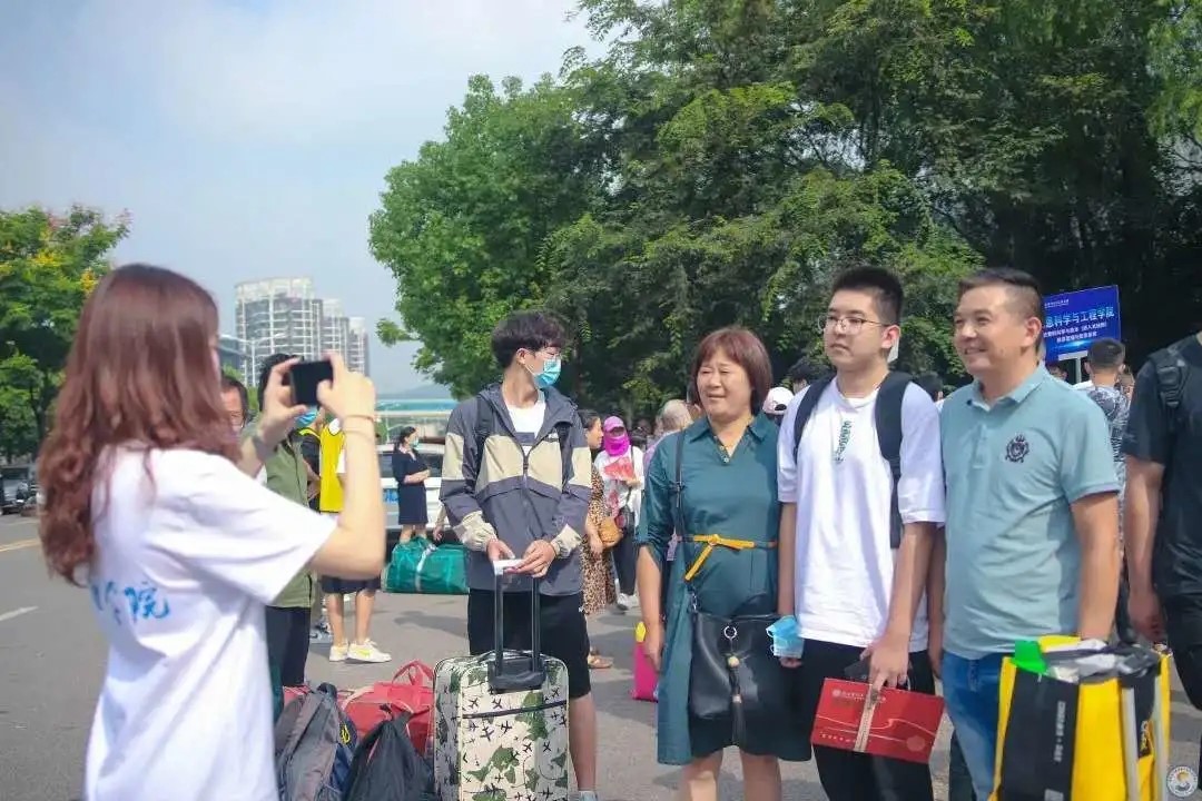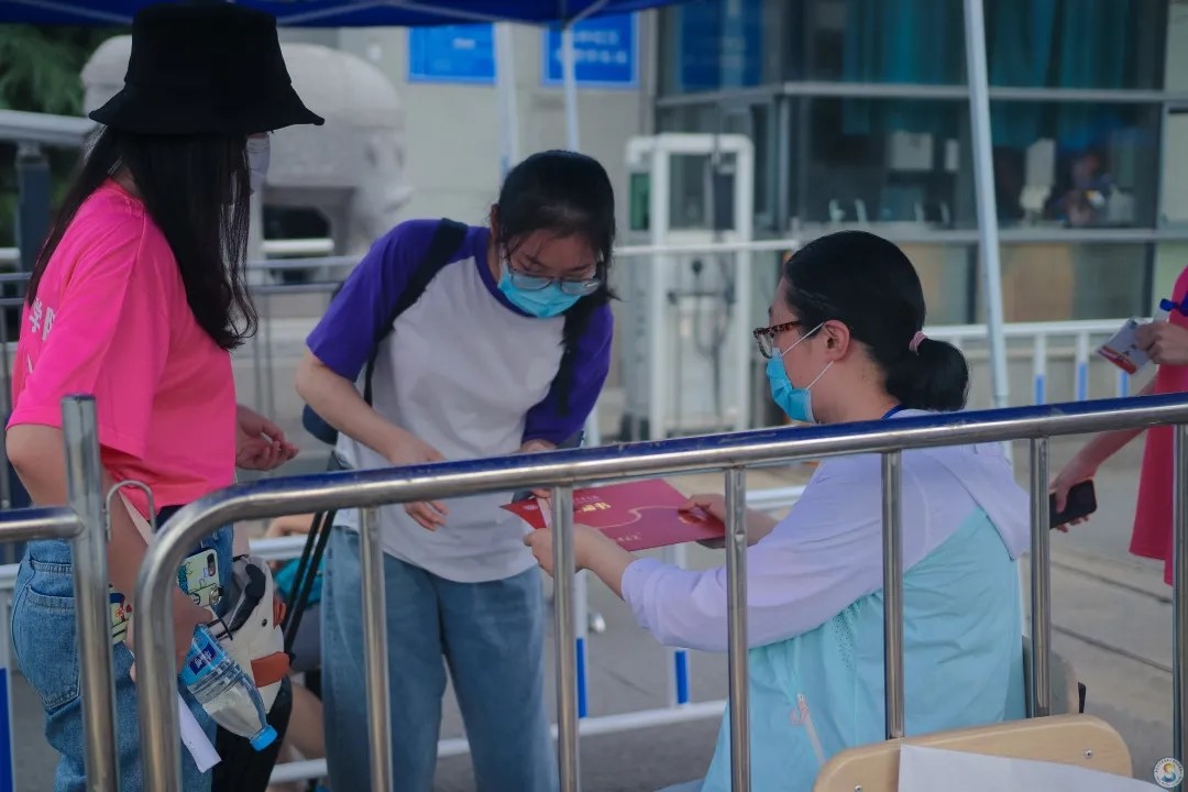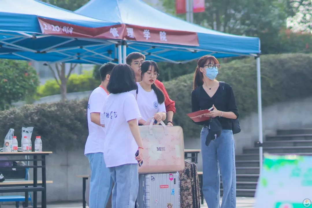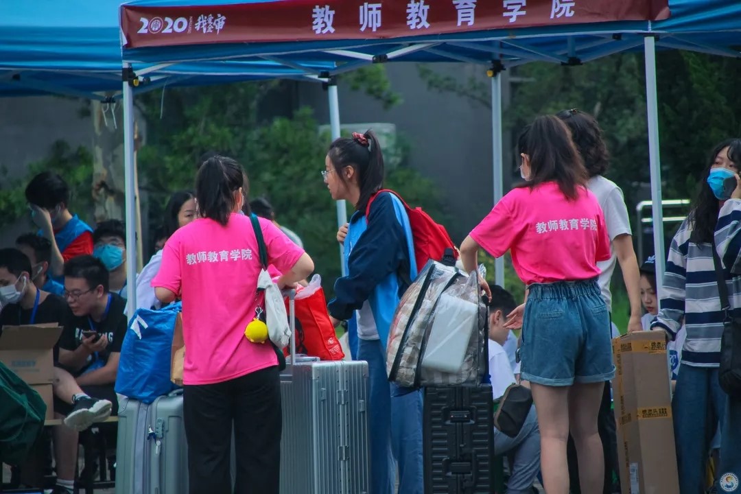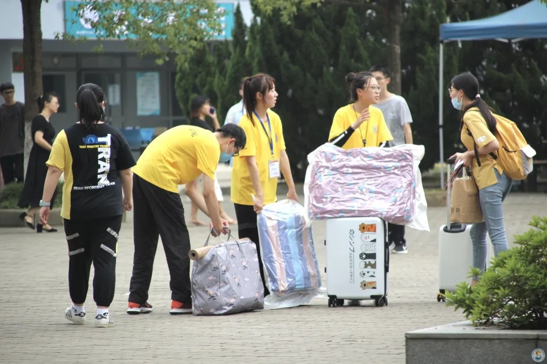 各二级学院学生志愿者穿着不同颜色的统一服装:蓝色代表会审学院,白色代表管理学院,粉色代表教师与教育学院,绿色代表国际商学院,黄色代表金融与经济学院。不同的色彩在人流中来回穿梭,亮眼且醒目,方便新生在有需要时能够快速准确地找到自己学院的学生志愿者。为了保证人流相对密集处空气流通,今年我校设置了多个室外接待点供新生暂时存放行李。