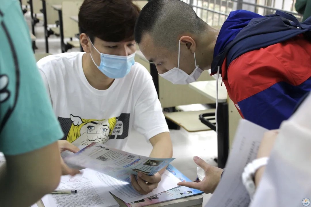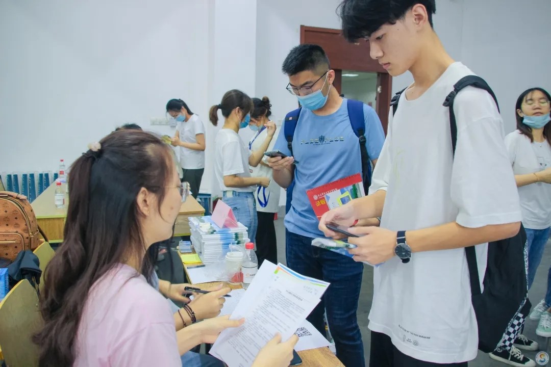 各个专业在教学楼不同教室设立了报到点,新生在学生志愿者的引导下办理入学手续,填写各项信息,领取校园卡、宿舍单以及军训物品。学生志愿者们热情地介绍学校环境和学校生活经验,他们的细致服务让2020级新生倍感温暖。