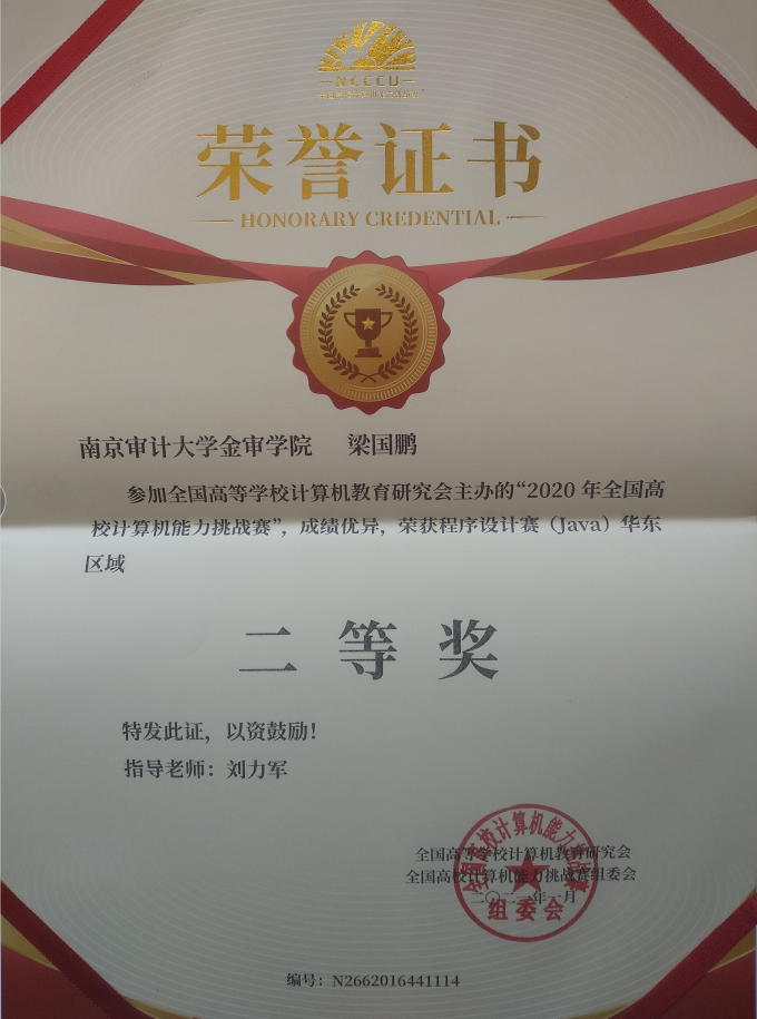 由全国高等学校计算机教育研究会主办的2020年第二届全国高校计算机能力挑战赛近日落下帷幕。参赛的我校2018级网络工程专业梁国鹏同学在信息科学与工程学院刘力军老师指导下,荣获大赛华东区域二等奖。
