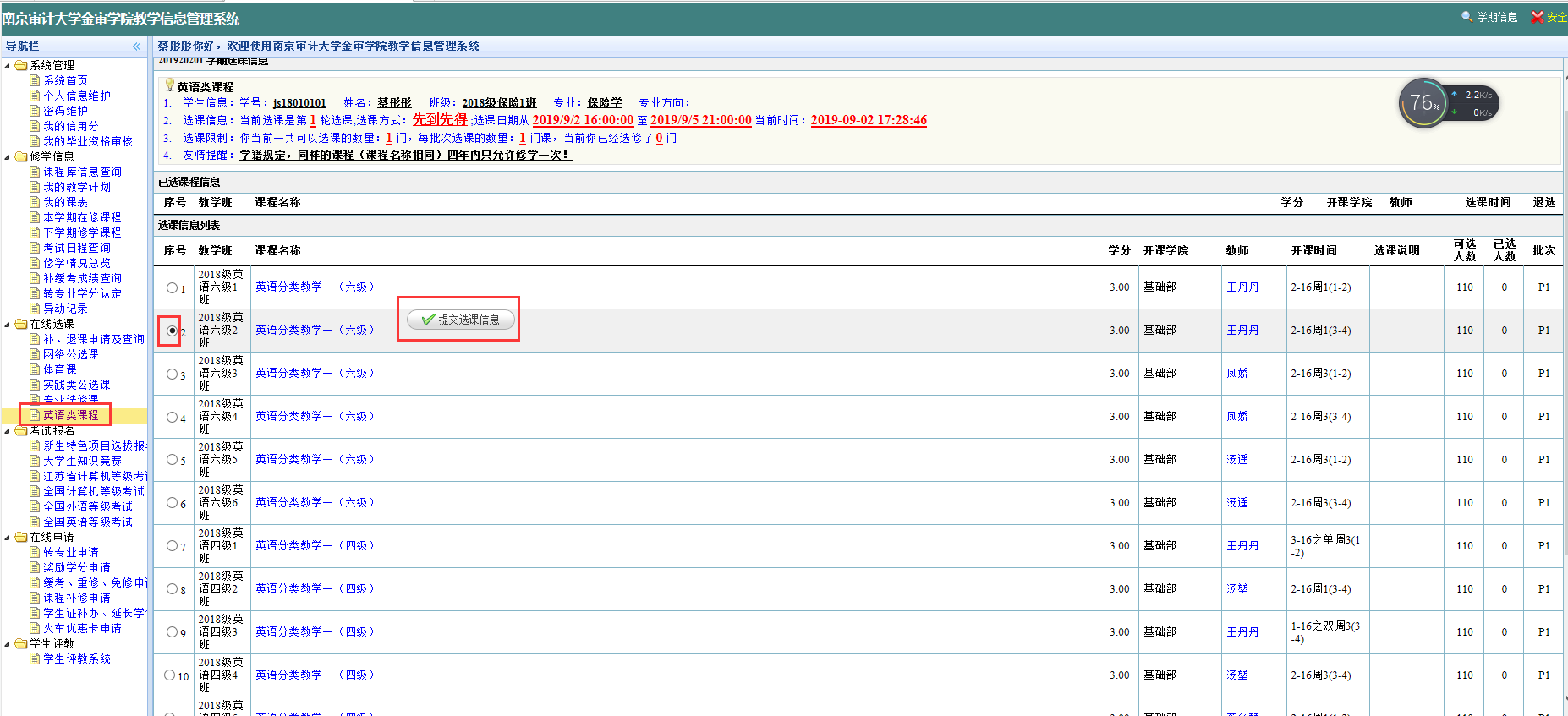1.登录教学信息管理系统:http://222.193.112.78/jwc/。输入用户名(学号)和密码,点击“登录”,在左边点击“英语类课程”进入选课界面进行选课。如图1和2所示。