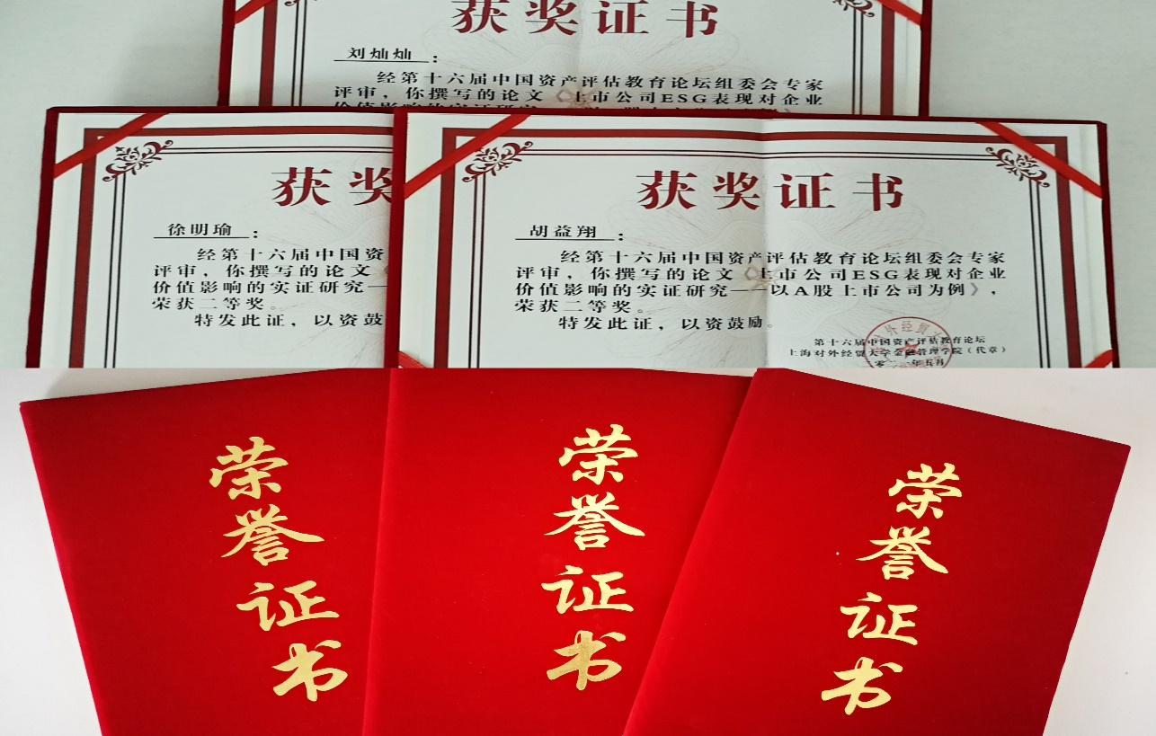 2021年5月29日,由中国资产评估协会指导、全国资产评估教育研究会主办、上海对外经贸大学金融管理学院承办的第十六届中国资产评估教育论坛在上海顺利举行。本次论坛共有来自全国各地30所高校、15所资产评估机构的资产评估人士参加,共收到征文投稿77篇。经过分论坛汇报答辩和论坛组委会专家评审,我校管理学院2018级管理实验班胡益翔同学参与撰写的论文《上市公司ESG表现对企业价值影响的实证研究——以A股上市公司为例》排名第四,荣获第十六届中国资产评估教育论坛二等奖。