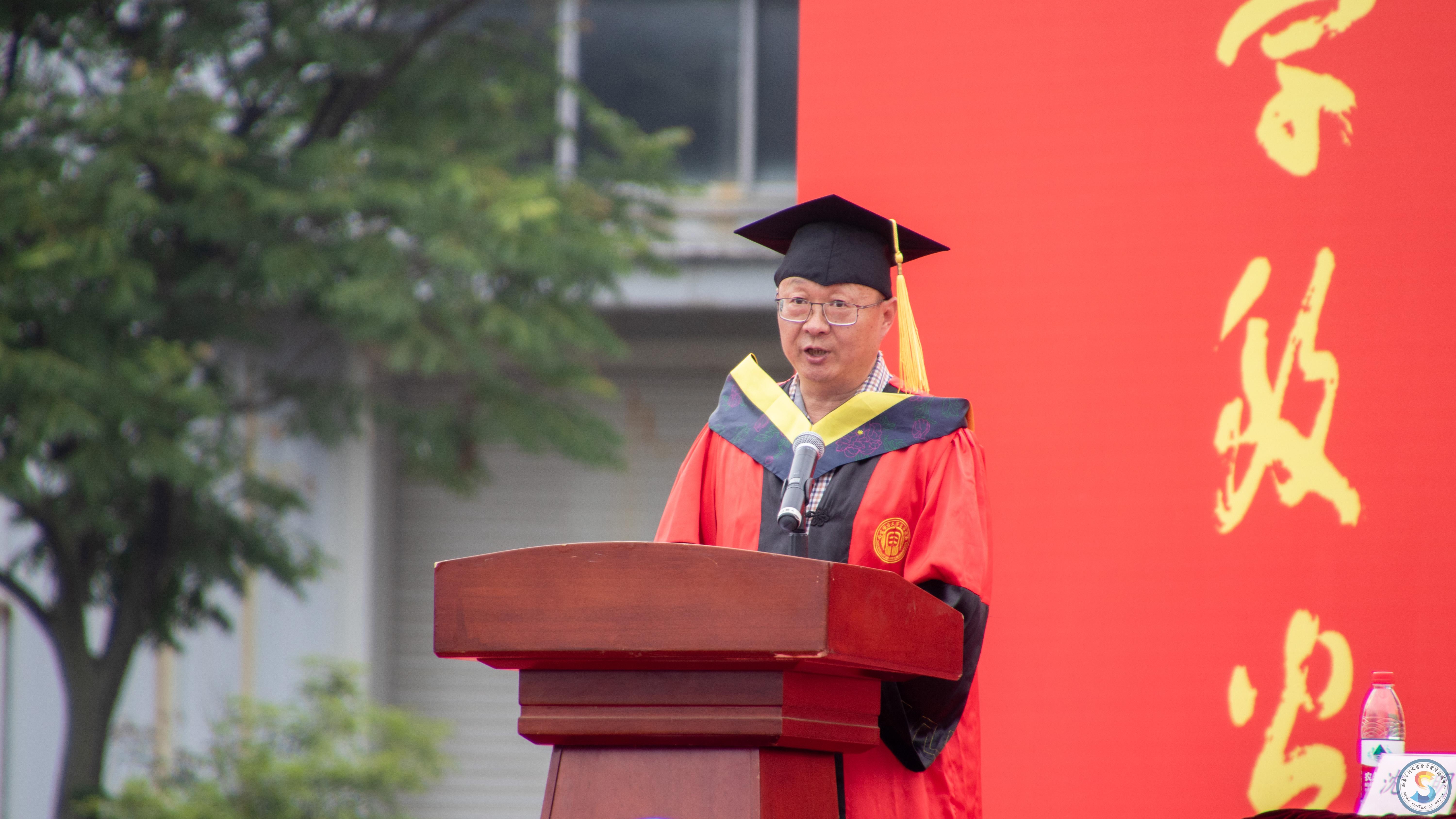 教师代表信息科学与工程学院刘军教授发言。他寄语广大毕业生学子:多陪父母,踏踏实实做好每一份工作,保持一颗善良的心和好奇心。