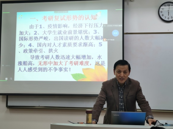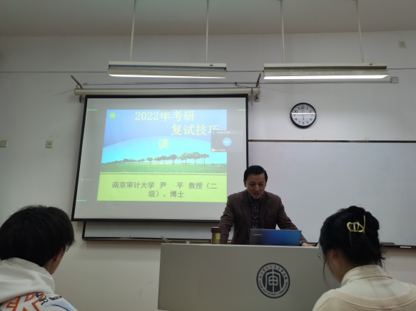 2022年硕士研究生考试国家线公布,分数大涨,为历年少见,在学生中引起强烈的反响,全国457万人考研,录取110万。为了进一步帮助进入复试的同学能够更好地上岸,3月14日晚,南京审计大学金审学院副院长尹平教授在B北503教室为毕业班学生举办“考研复试技巧”专题讲座,由于疫情原因本次讲座线上线下同步进行。