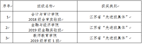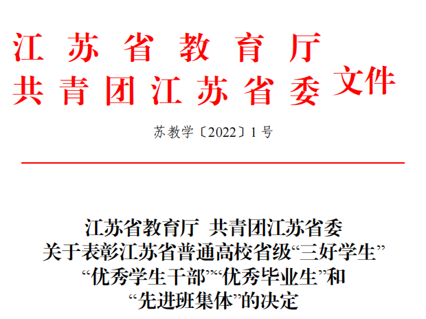 日前,江苏省教育厅、共青团江苏省委联合发文公布了《关于表彰江苏省普通高校省级“三好学生”“优秀学生干部”“优秀毕业生”和“先进班集体”的决定》,我校庄春等6名同学荣获江苏省“三好学生”荣誉称号,徐子毅等5名同学荣获江苏省“优秀学生干部”荣誉称号,李晨曦等4名同学荣获江苏省“优秀毕业生”称号,2018级会审实验班等3个班级荣获江苏省“先进班集体”称号。
