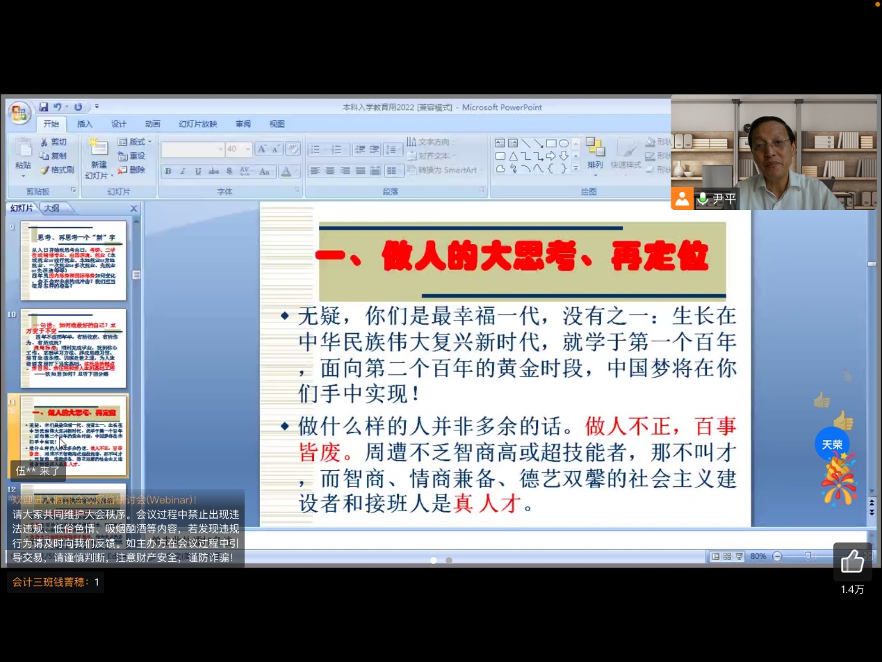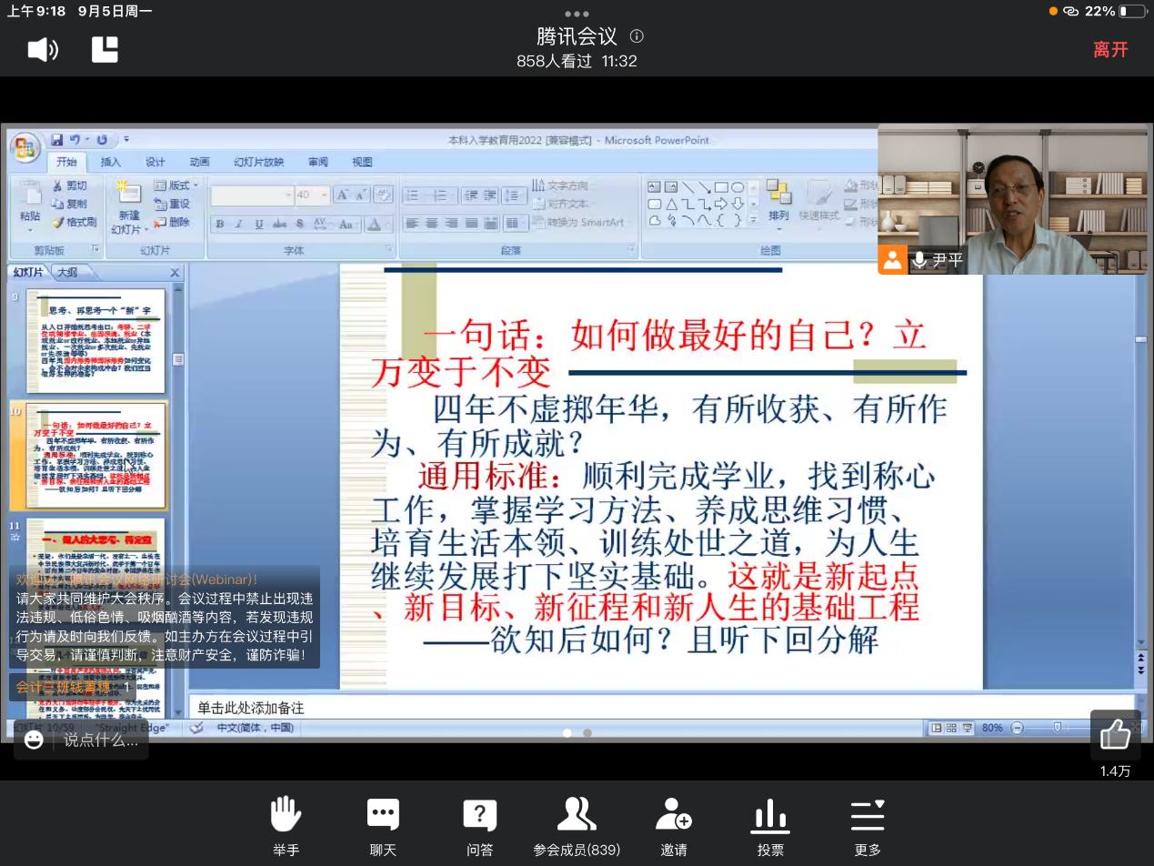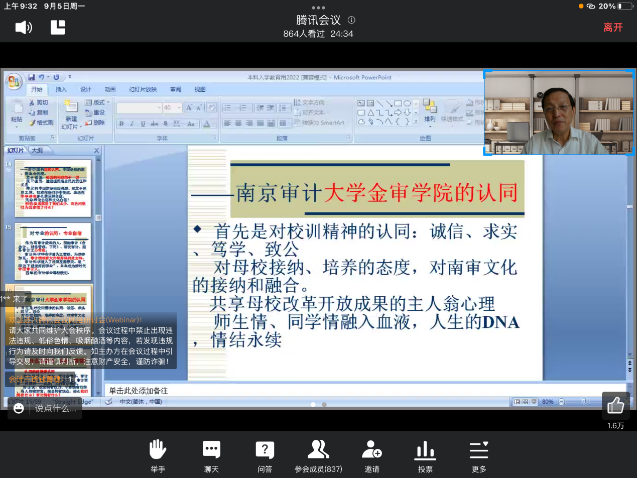 2022年9月6日,会计与审计学院(国际商学院)的大一新生在腾讯会议上开始大学的第一课,在尹平教授的引导下,他们了解了大学教育的本质,以及个人的成才担当,对于自己的大学生活有了更加清晰的认知和规划。