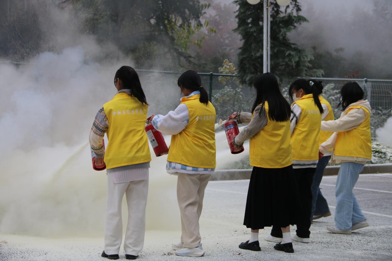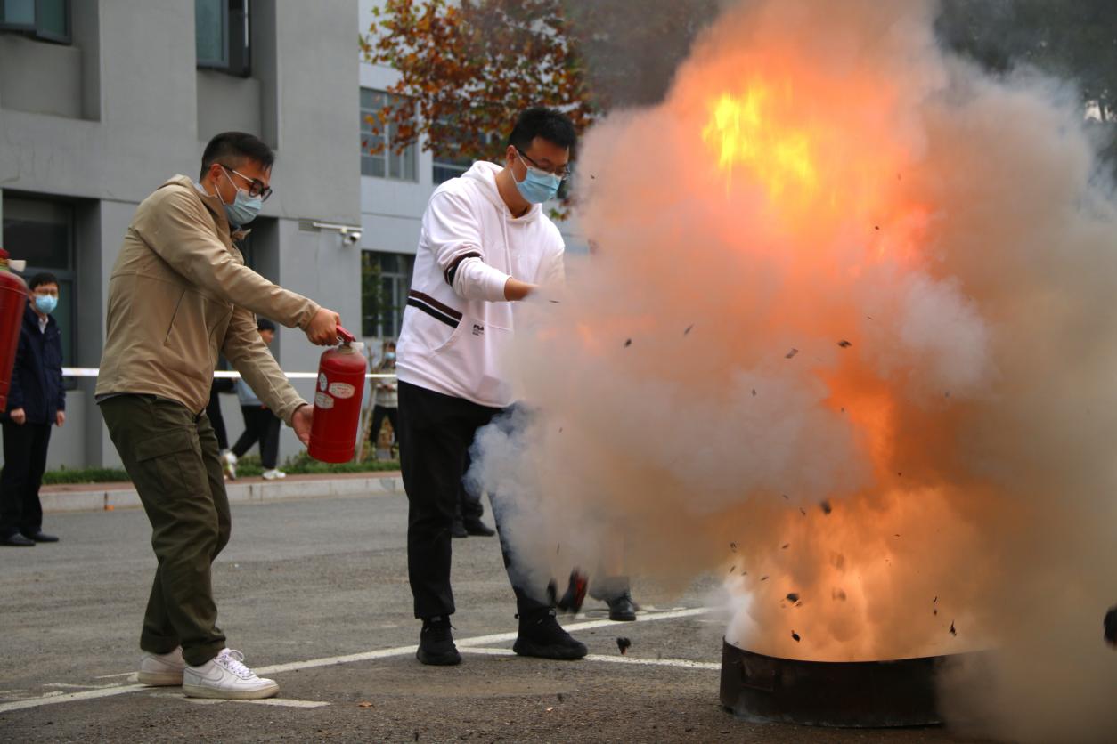 演练以校园起火为背景,着火后,楼内消防报警设备发出报警信号,参与人员立即使用干粉灭火器进行灭火。