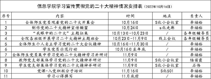学院在统筹疫情防控和教育教学工作的前提下,对全院学习宣传贯彻党的二十大精神进行了总体、全面的安排部署,制定学习宣传贯彻党的二十大精神情况安排表。