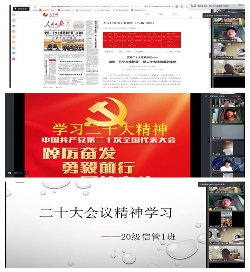 全院各班级相继开展了“我眼中党的二十大”主题征集和学习党的二十大精神主题班会活动,同学们通过撰写文章、拍摄短视频等形式讲述自己眼中的党的二十大,通过在班会上边听边做记录,就报告中的新提法、新思想进行了交流和探讨,大家通过诵读报告内容,撰写学习心得,深刻领会党的二十大精神的内涵与意义。