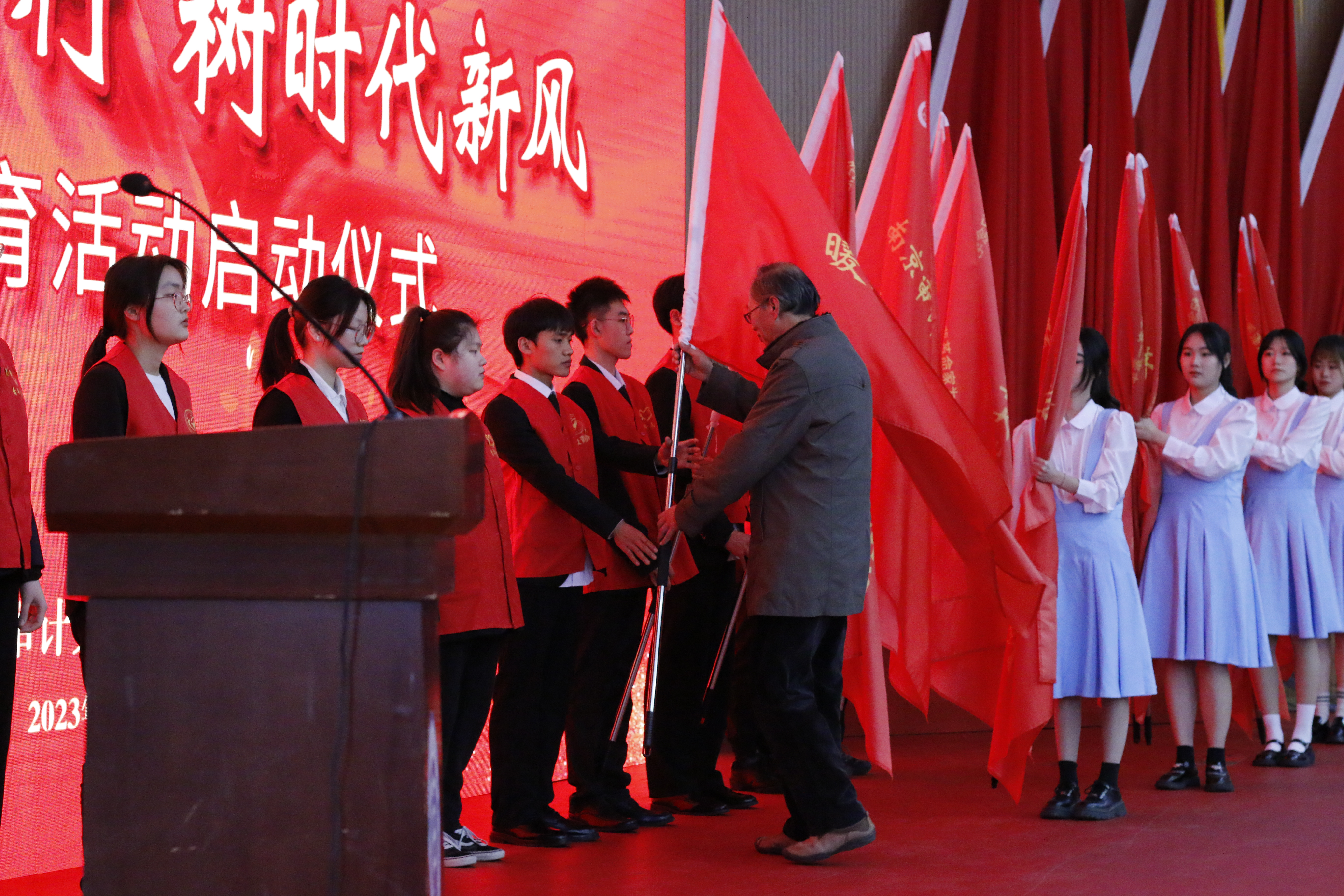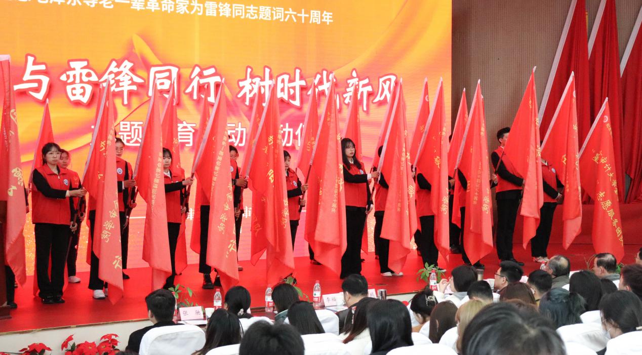 副院长傅康生、纪委书记沈明为志愿团队授旗,青年志愿者协会主席宣读倡议书并宣誓,演讲与口才协会带来《学雷锋 正青春》情景剧表演,雷锋战友赵明才同志对金审学子送上寄语。