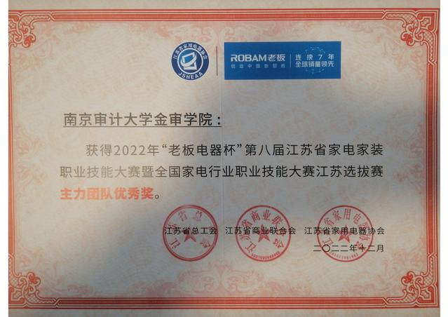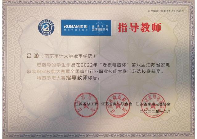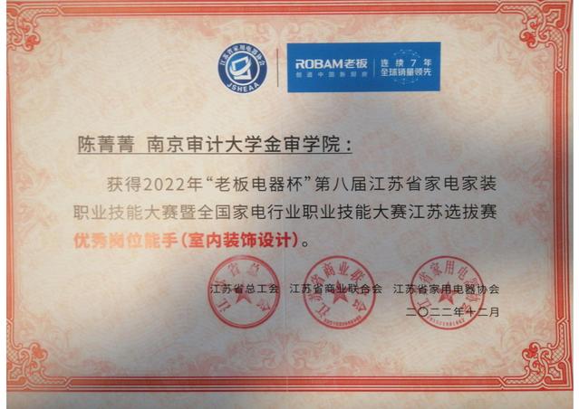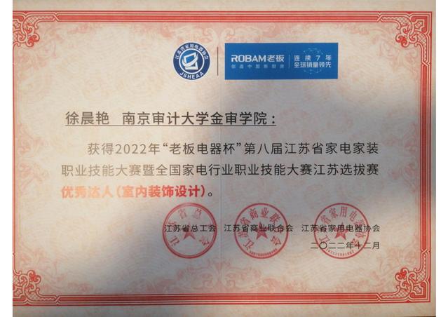 我院荣获2022年“老板电器杯”第八届江苏省家电家装职业技能大赛暨全国家电行业职业技能大赛江苏选拔赛主力团队优秀奖,徐晨艳老师获优秀达人(室内装饰设计)并授予江苏省技术能手称号、陈菁菁老师获优秀岗位能手(室内装饰设计)、吕游老师获大赛指导教师称号。本次大赛展示了我院教师精湛的专业技能,同时给予教师们与行业优秀人员相互交流学习的机会。