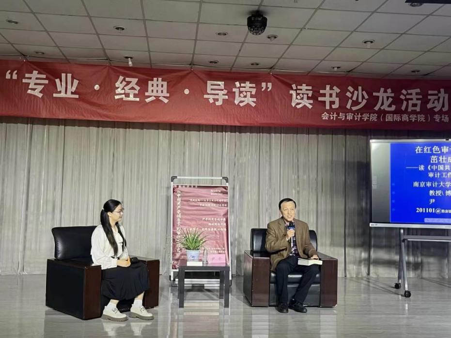 学校副校长、博士生导师尹平教授为大家做经典导读,尹教授引用习近平总书记的两句话:“不忘初心、牢记使命”,“以史为鉴,开创未来”,表示在新时代大背景下,学习党史,回顾党的红色审计史,以及牢记中华民族伟大复兴中审计的贡献,不仅对于审计专业学习和理解习近平新时代中国特色社会主义思想具有重大意义,更对面向“两个百年”具有重大意义。最后,尹教授指出审计追求公平、正义、规范、法制、廉政五个方面,是新时代的先进文化,与社会主义核心价值观一脉相承。他倡导大家齐心协力,为建立新时代新审计而奋斗。