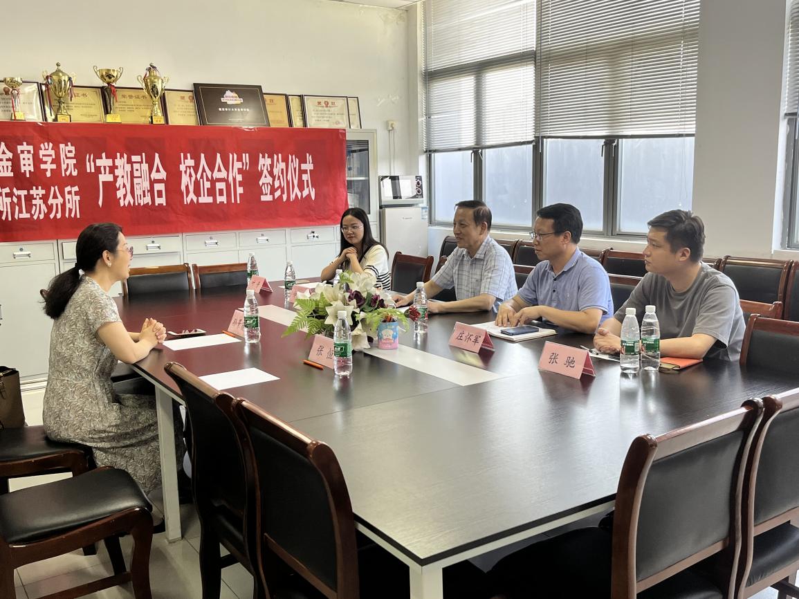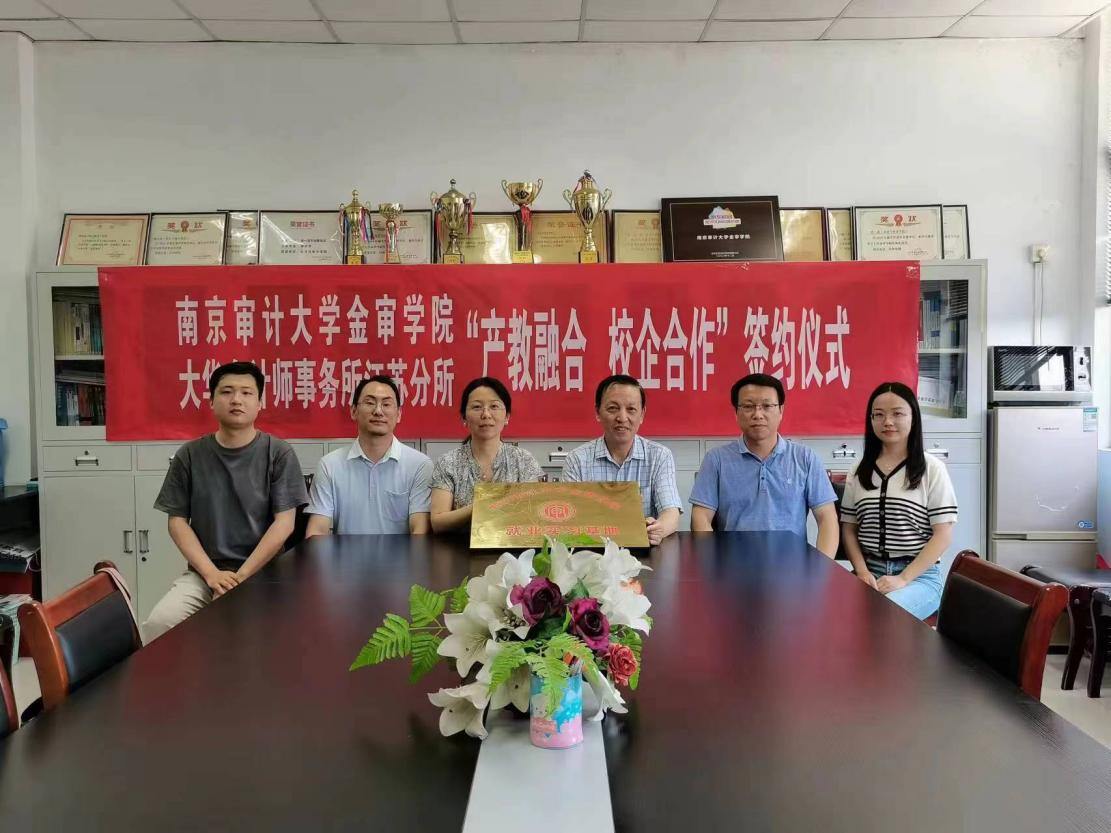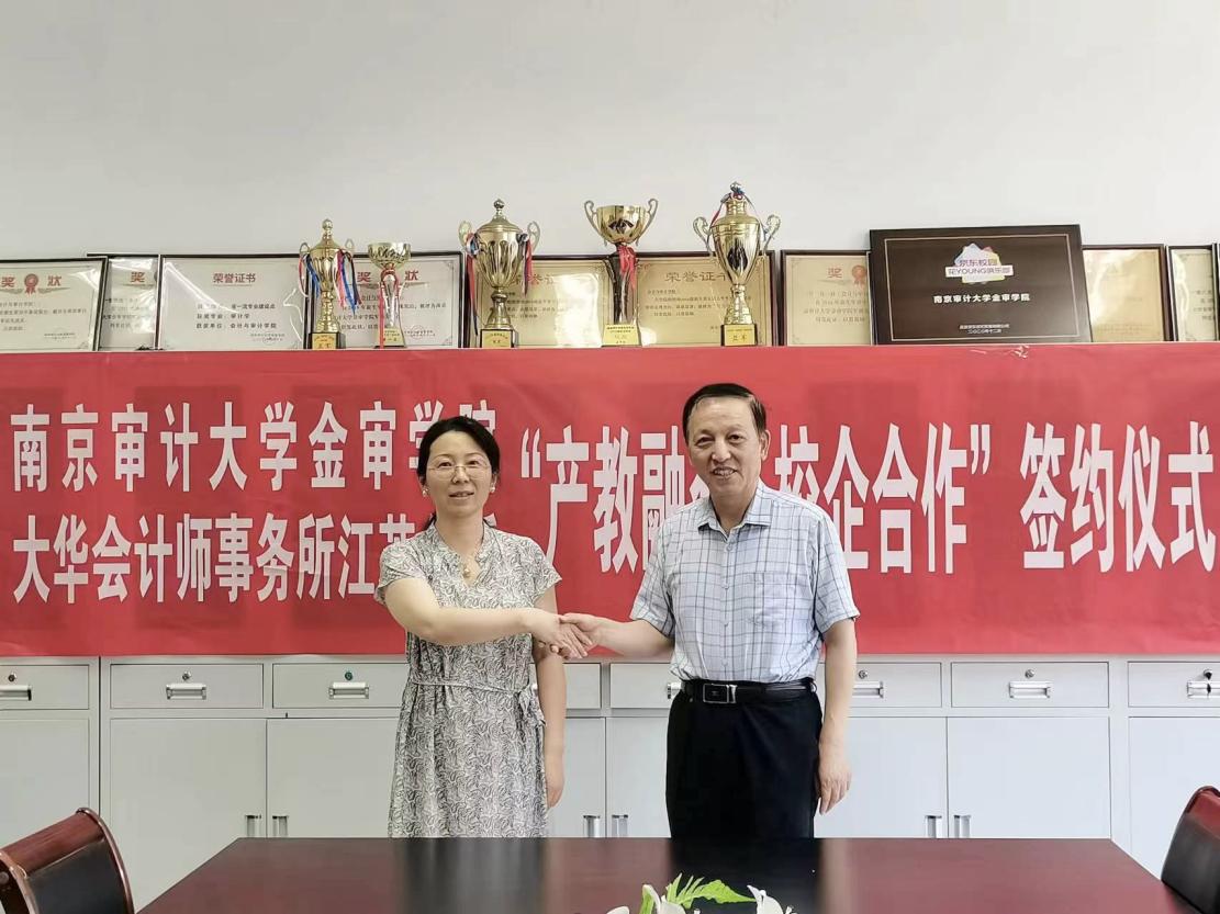 为深化产教融合,创新人才培养模式,拓宽学生实习和就业渠道,会计与审计学院于6月14日15时10分在B东505与大华会计师事务所江苏分所举行合作签约仪式。南京审计大学金审学院副校长尹平、会计与审计学院党总支书记庄怀军、副书记张驰、国际商学院教研室主任叶子参加签约仪式。大华会计师事务所江苏分所合伙人孙景霞、人力资源经理张恒参加此次活动。