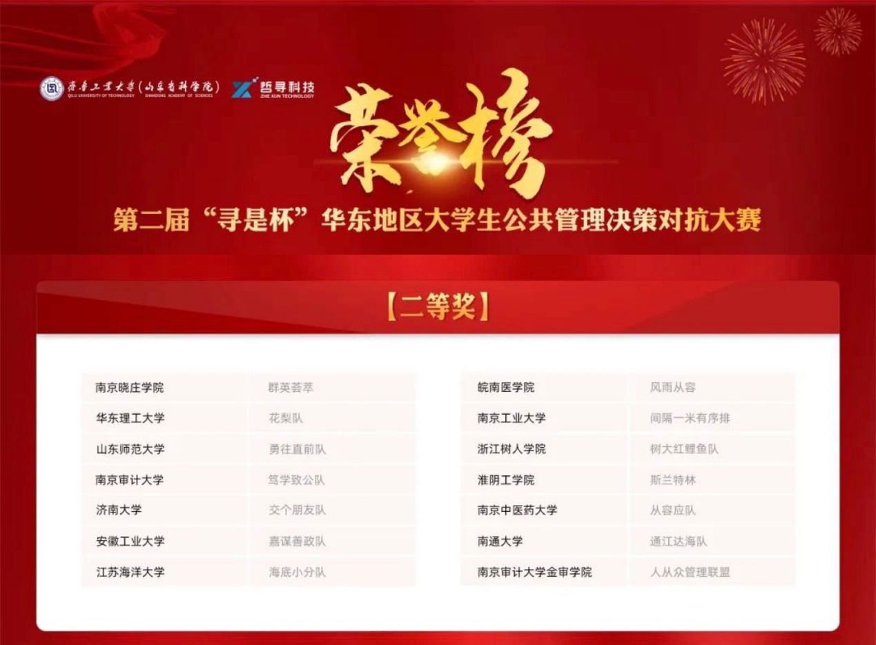为落实立德树人根本任务、加快新文科和国家一流专业建设,第二届“寻是杯”华东地区大学生公共管理决策对抗大赛在山东济南举行,来自华东赛区5个省市、28所高校的29支参赛队伍参加了本次大赛。管理学院人从众管理联盟参加了本次大赛并取得二等奖的优异成绩。