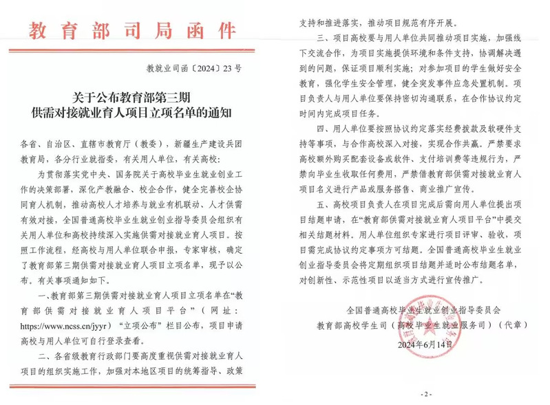 教育部实施的供需对接就业育人项目,旨在推动就业与培养有机联动、人才供需有效对接,帮助用人单位培养和招聘更多实用型、复合型和紧缺型人才,促进高校毕业生更加充分更高质量就业。为有意愿与高校开展人才供需对接和就业育人合作的用人单位提供平台,用人单位结合国家战略和实际需要提出项目指南,提供项目资源支持,通过与高校合作加快急需紧缺人才培养,优化自身人力资源配置。供需对接就业育人项目分为定向人才培养培训、就业实践实习基地建设、人力资源提升三类。