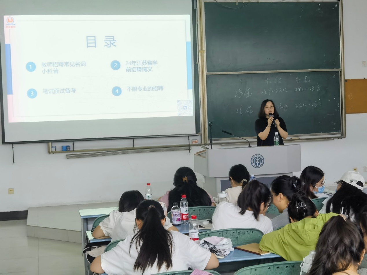 9月4日,2025年教师招聘考试讲座在B南208开展。来自学之信的任浩老师首先对教师招聘考试的常见类型进行了说明,接下来回顾了2024年江苏省幼儿园教师招聘情况,详细罗列了江苏各市幼儿园教师招聘的人数、招聘的类型以及考试的时间和内容。对于笔试和面试如何准备的问题,任老师从时间安排、准备重点等方面给予了指导建议。最后结合部分学生跨学段从教的意愿提供了招考信息。