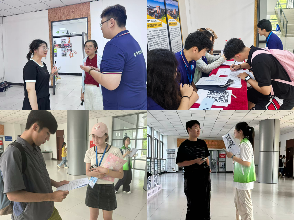 报到现场,流程清晰高效:填写报名表、入班面试、新班级登记、领取校园卡,每一步都有专人引导。B南205、B北101的面试室里,新生们自信展现英语能力,畅谈对专业的理解与未来规划,青春朝气扑面而来。面对“课程安排”“宿舍生活”等疑问,工作人员始终微笑解答,用行动诠释着迎新初心。