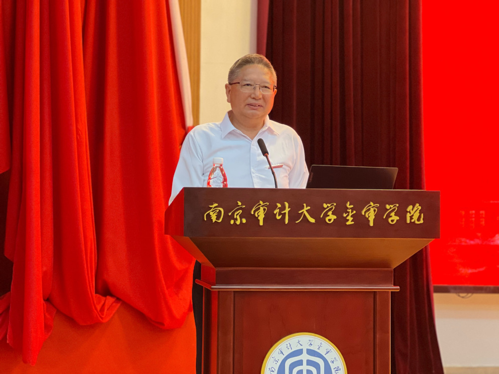 9月19日下午,南京审计大学金审学院2025级新生开学第一课在图书馆报告厅举行。校长俞安平以“秉抗战精神之魂 铸数智时代之剑 成就出彩的‘新金审人’”为主题,为全体新生带来了一场内涵深刻、情感真挚的思政大课。校长助理成庭羽、孟琪璐,各二级学院党总支书记,辅导员与2025级新生代表现场聆听,全体新生通过线上线下同步观看。
