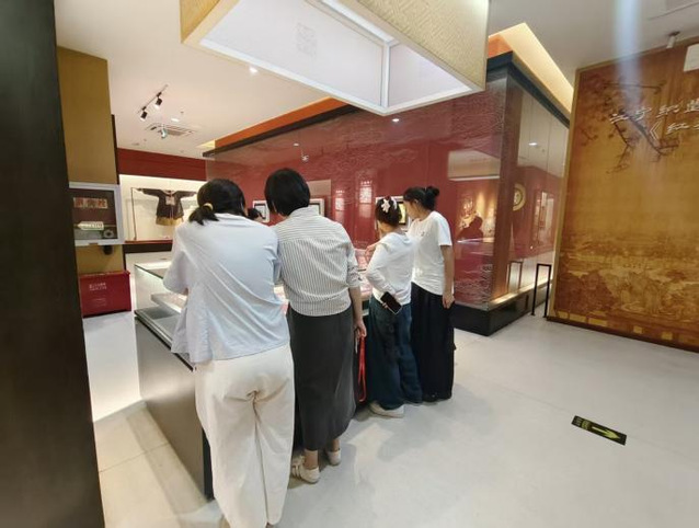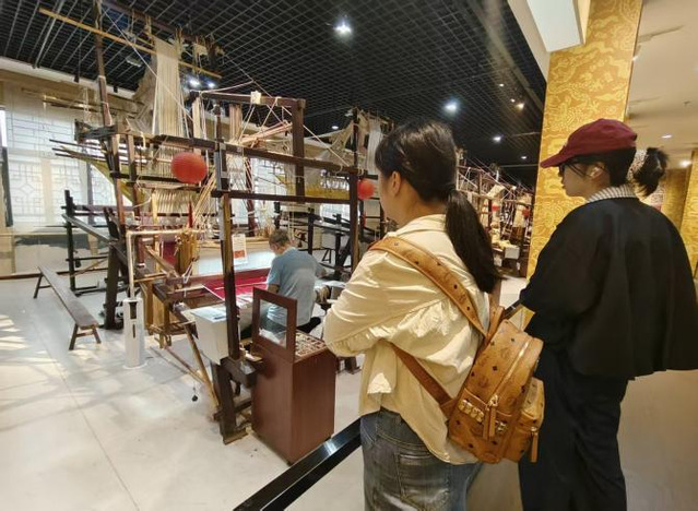 南京云锦因其绚丽如云霞而得名,是中国古代织锦技艺的巅峰代表,被誉为“锦中之冠”,已被列入人类非物质文化遗产代表作名录。步入博物馆,同学们立刻被馆内陈列的精美云锦作品所震撼。在讲解员的引导下,大家依次参观了各个展区,从历史沿革到工艺流程,从纹饰图案到宫廷应用,系统了解了南京云锦近千年的发展脉络。龙袍、冕服、补子等一件件华美绝伦的实物,以其富丽堂皇的色彩、巧夺天工的技艺和深邃的文化寓意,生动再现了古代皇家织造的辉煌与极致匠心。这种跨越时空的对话,使同学们不仅惊叹于传统工艺的精湛,更对中华民族追求卓越、精益求精的工匠精神肃然起敬。