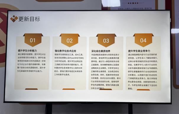 财务管理系陶思奇老师围绕《财务报表分析》课程,以“数字时代财经人才培养”为核心,汇报了“固定+动态”的价值引领融入路径与案例库更新成果。教学方法上突破传统模式,推行学生视频制作、AI辅助财务分析等实践任务,并采用“学生互评+教师评分”的多元评价机制,有效提升了学生的实践能力,课程改革成效显著。学生团队在财经大数据分析竞赛中斩获佳绩,获评校级大创项目二等奖,课程组教师同步发表多篇教学研究论文。