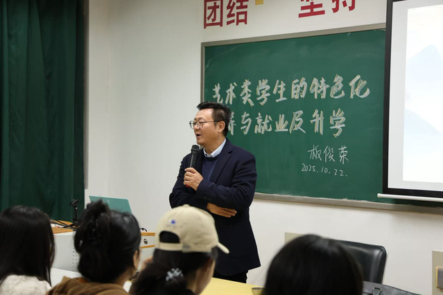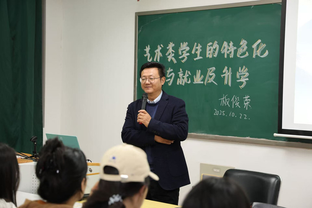 为了精准对接新时代艺术类人才的培养需求,明晰学生成长与发展方向,艺术设计学院邀请南京航空航天大学艺术学院院长、学位委员会主任板俊荣于2025年10月22日晚,在艺术楼505展开一场主题为“艺术类学生的特色化培养与就业及升学”的讲座。学生代表齐聚一堂,现场座无虚席,互动热烈。