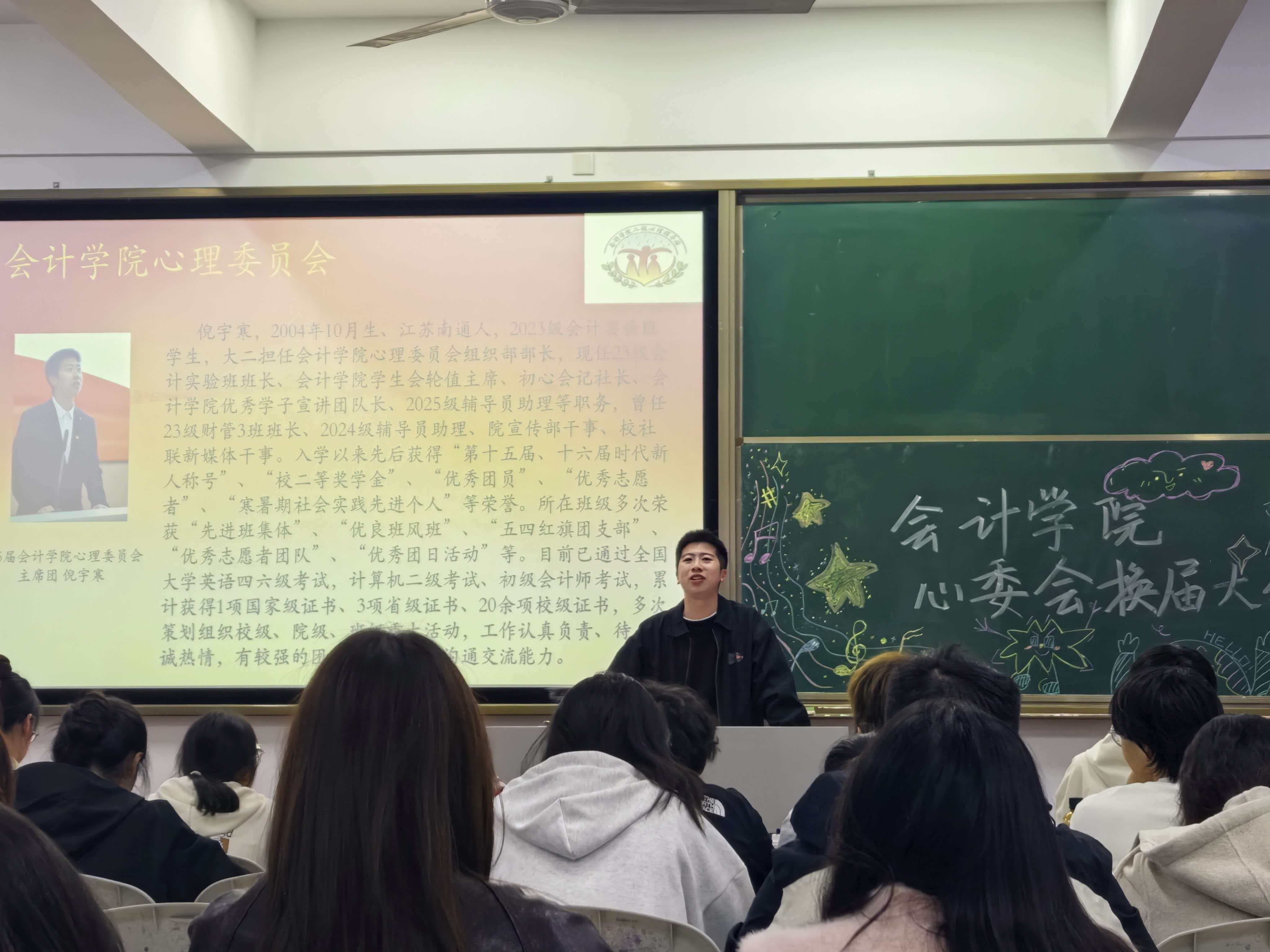 议程推进中,上届心理委员会主席朱静玫分享了从初入部门的青涩到独当一面的成长历程,讲述了工作中遇到的挑战、收获的感动以及团队协作带来的力量。她勉励新成员们要珍惜平台、勇于担当、保持热爱,将心理委员会的温暖与责任传递下去。随后,新任心理委员会主席倪宇寒代表新一届全体成员发言。他向学校领导、指导老师的信任,以及往届成员的辛勤付出表达了诚挚的感谢。面对未来的工作,倪主席提出了清晰的工作思路与规划。他强调,新一届心理委员会将在继承中发展,在创新中突破。
