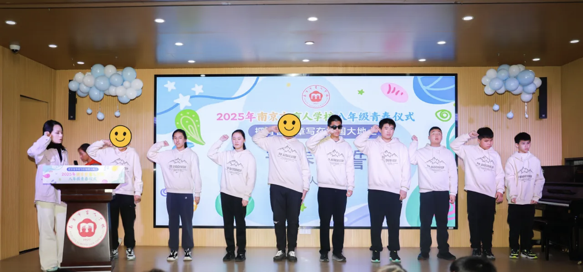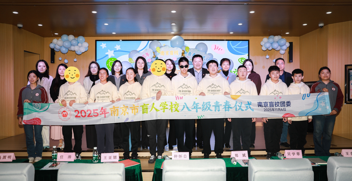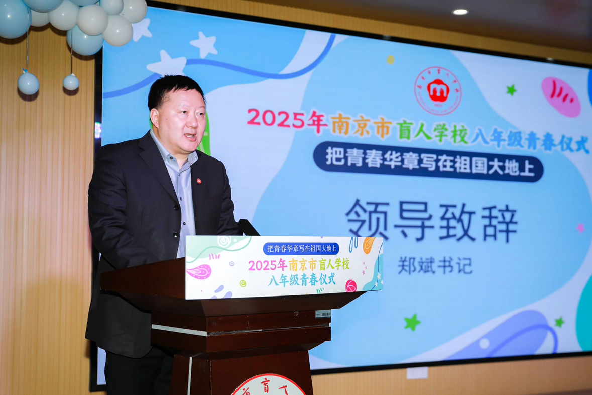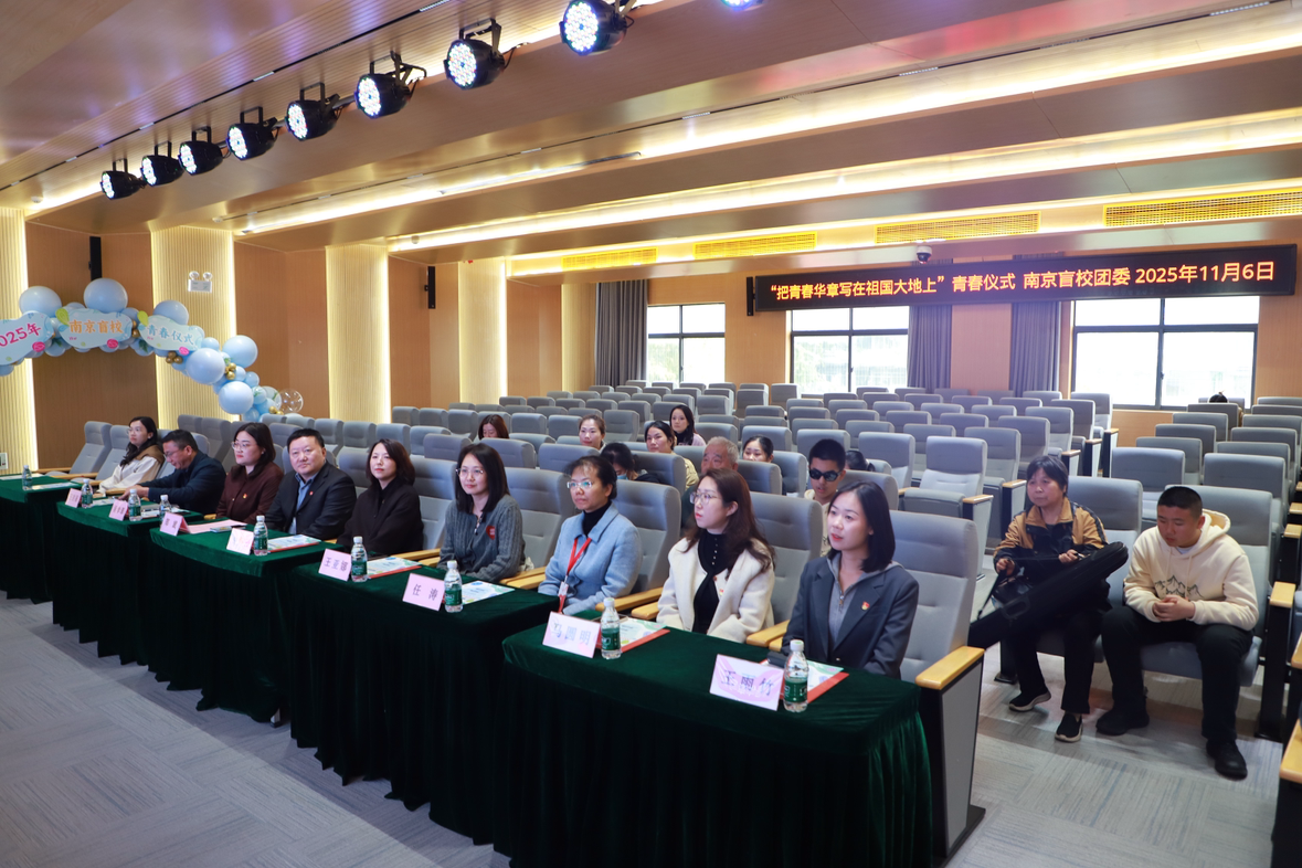 2025年11月6日13时30分,南京市盲人学校“把青春华章写在祖国大地上”八年级青春仪式在学校报告厅举行。校党总支书记郑斌、校长任涛、副校长王吉星等校领导出席。校团委还特别邀请了南京审计大学金审学院审计学院院长仲怀公、党总支书记王亚娜以及吴学翠、马圆明、王雨竹等老师作为嘉宾,与八年级全体师生、家长共同见证这一青春盛典。