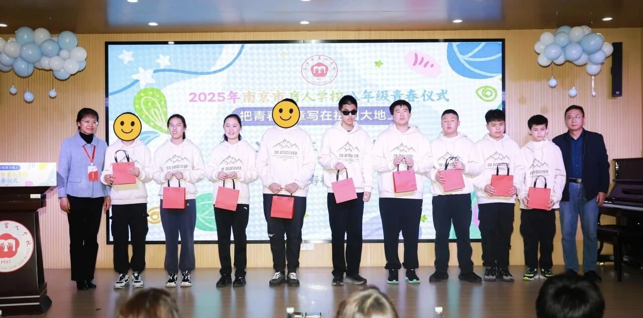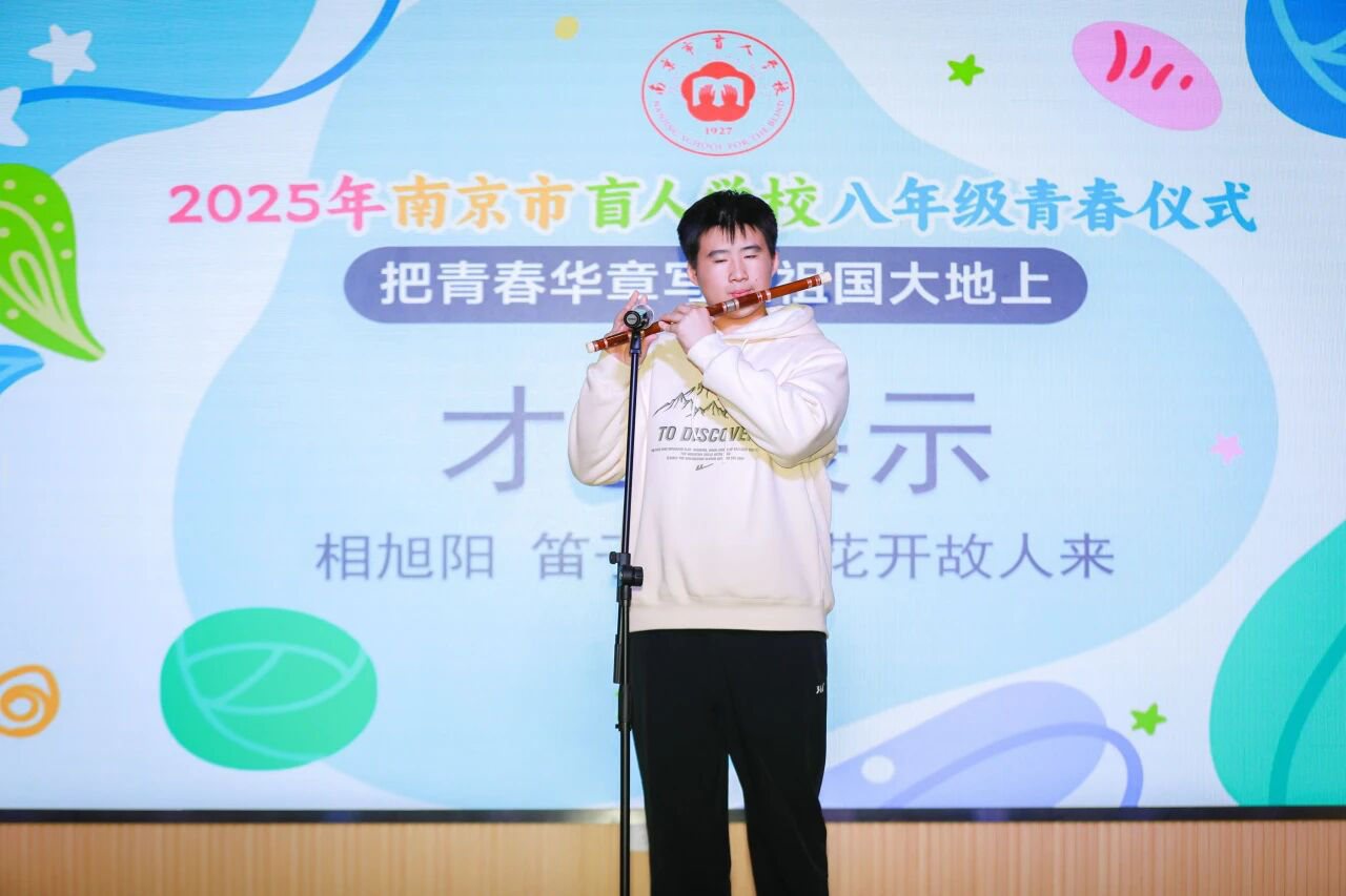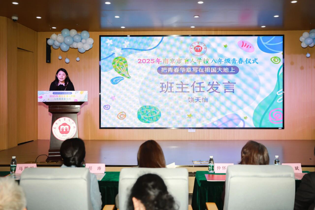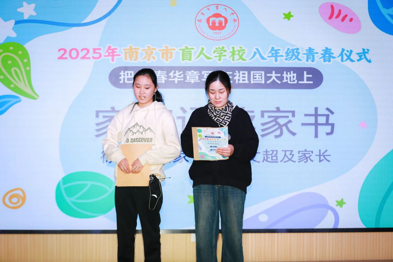 2025年11月6日13时30分,南京市盲人学校“把青春华章写在祖国大地上”八年级青春仪式在学校报告厅举行。校党总支书记郑斌、校长任涛、副校长王吉星等校领导出席。校团委还特别邀请了南京审计大学金审学院审计学院院长仲怀公、党总支书记王亚娜以及吴学翠、马圆明、王雨竹等老师作为嘉宾,与八年级全体师生、家长共同见证这一青春盛典。