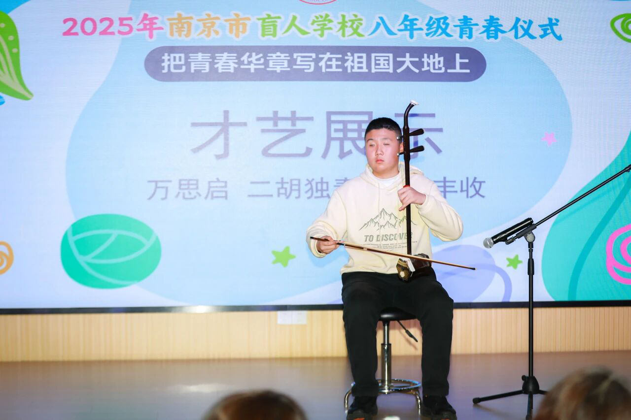 随后的才艺展示环节,同学们各展风采:相旭阳的《花开故人来》、万思启的二胡独奏《喜唱丰收》、周子扬的钢琴独奏《我的祖国》,以及刘昶、相旭阳的合唱《一程山路》,展现了视障学生的艺术才华与昂扬向上的精神面貌。
