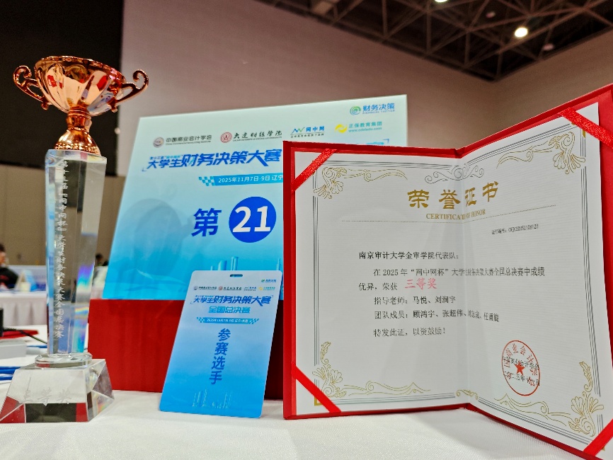 11月8日,第十三届 “网中网杯” 大学生财务决策大赛全国总决赛在辽宁大连圆满落幕。本次大赛由中国商业会计学会主办、大连财经学院承办,厦门网中网软件有限公司、厦门网中网教育科技有限公司、北京东大正保科技有限公司及正保会计网校联合支持。会计学院代表队凭借扎实的专业功底、稳定的赛场发挥与默契的团队协作,一路过关斩将,最终斩获国家级三等奖。同时,马悦、刘润宇两位指导老师荣获 “优秀指导教师” 称号。