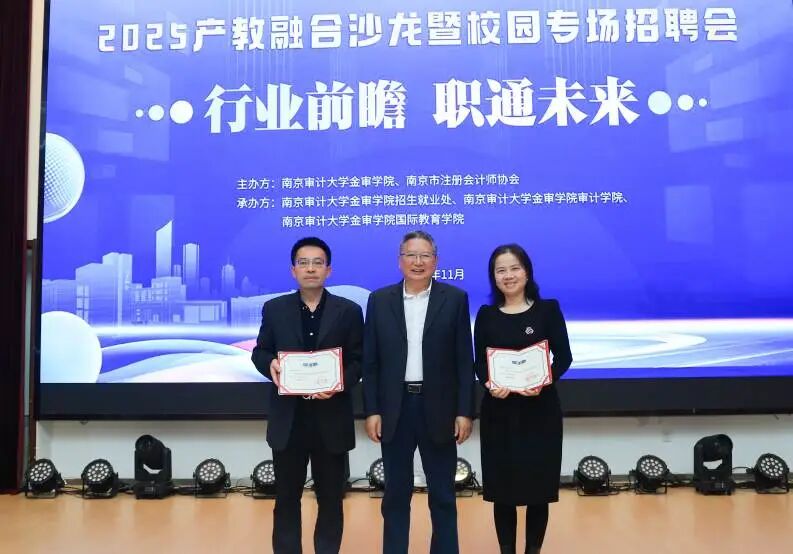 为深化产教融合、校企协同育人,搭建高校与行业、企业的人才供需桥梁,助力学生精准对接职场、实现高质量就业,11月12日下午,我校联合南京市注册会计师协会成功举办 “行业前瞻 职通未来” 产教融合沙龙暨校园专场招聘会。行业精英、学校专家与金审学子汇聚一堂,以政策引领、经验分享、岗位对接为核心,构建起 “校 - 协 - 企” 三方联动的育人路径。