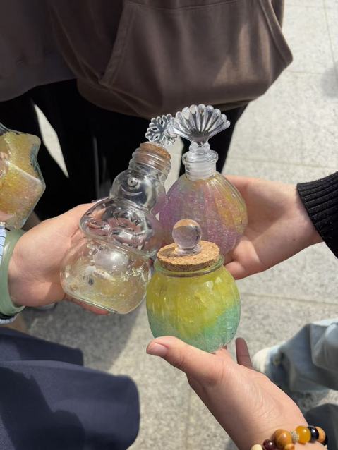 “瓶中寄情”区域则涌动着别样的温馨。一份手作的专注感扑面而来。学子们于指尖流转间,耐心将饱满的水宝宝、莹润的贝壳与闪光亮片精心布局,构筑属于自己的瓶中微缩景观。随着作品的逐渐成型,内心的情绪也得以梳理和安放。这些瓶中封存的,不仅是错落有致的景致,更是此刻被定格的宁静与心意。