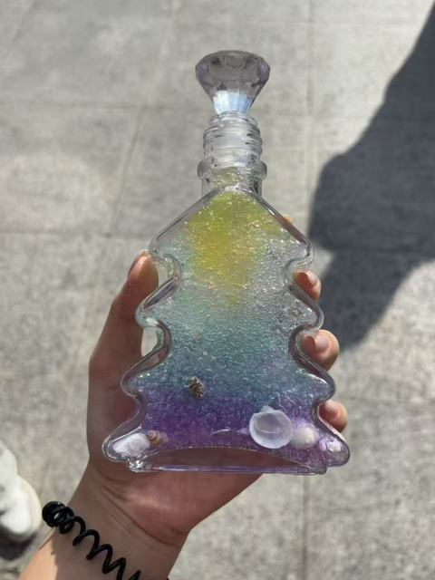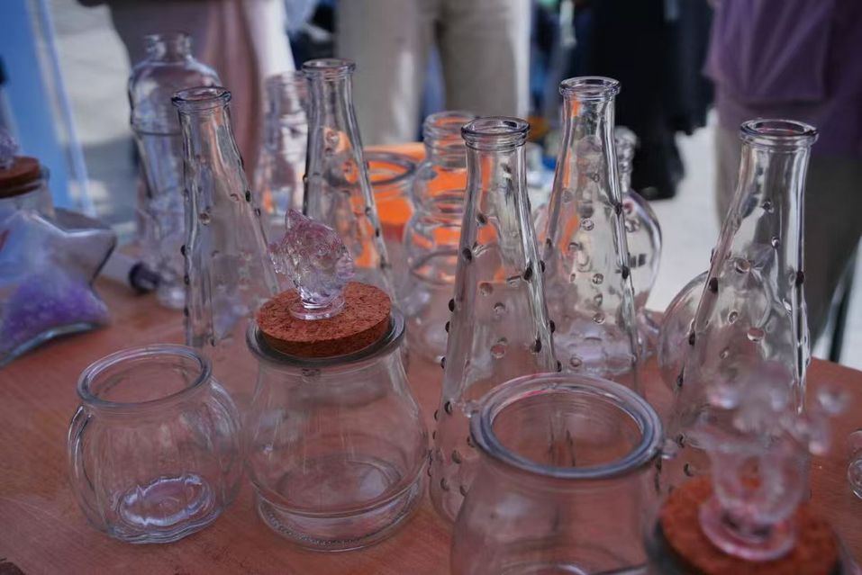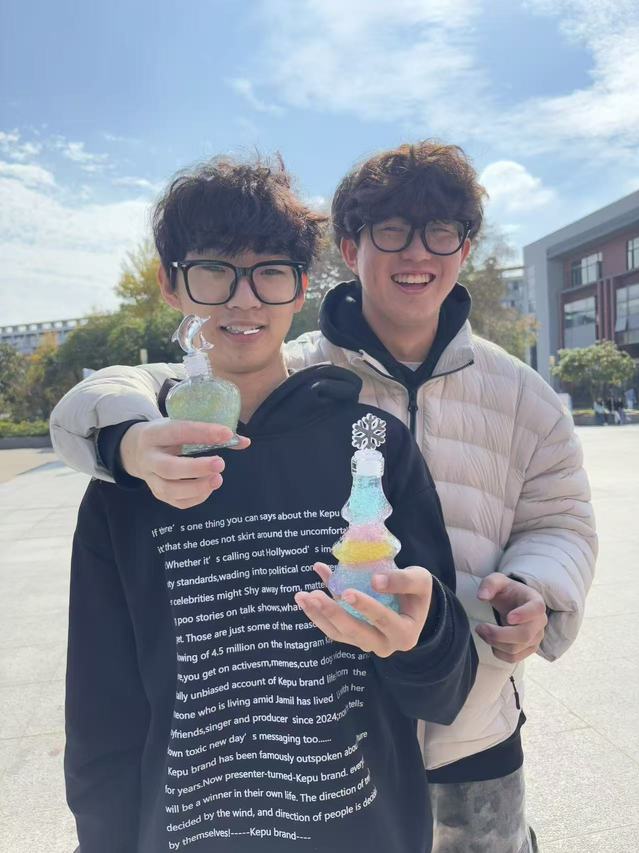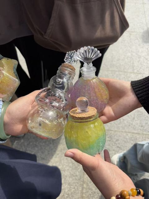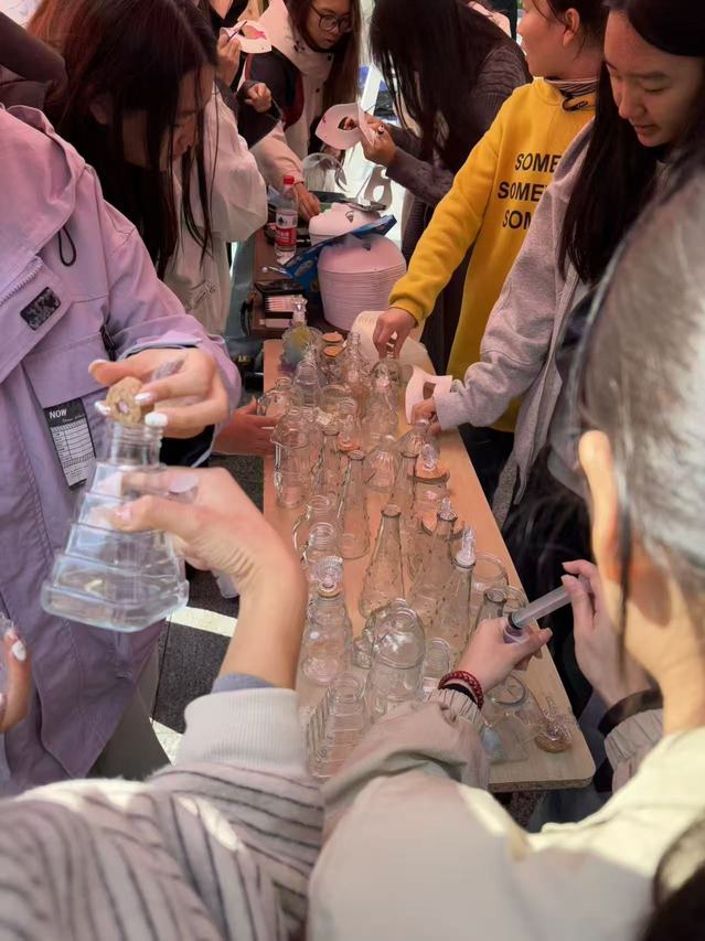 活动当天,石头广场被布置得温馨又充满活力:桌子上整齐摆放着透明玻璃瓶、十余种颜色的水宝宝颗粒、小巧精致的小海螺贝壳,角落的音响循环播放着白噪音与轻音乐,空气中还弥漫着淡淡的活跃热闹气息。“蓝色水宝宝象征平静,能缓解焦虑;粉色代表温暖,可传递积极情绪;黄色充满活力,适合提振精神……”活动伊始,班长为同学们讲解许愿瓶的制作方法,随后示范水宝宝分层摆放的技巧,让大家快速掌握创作方法。